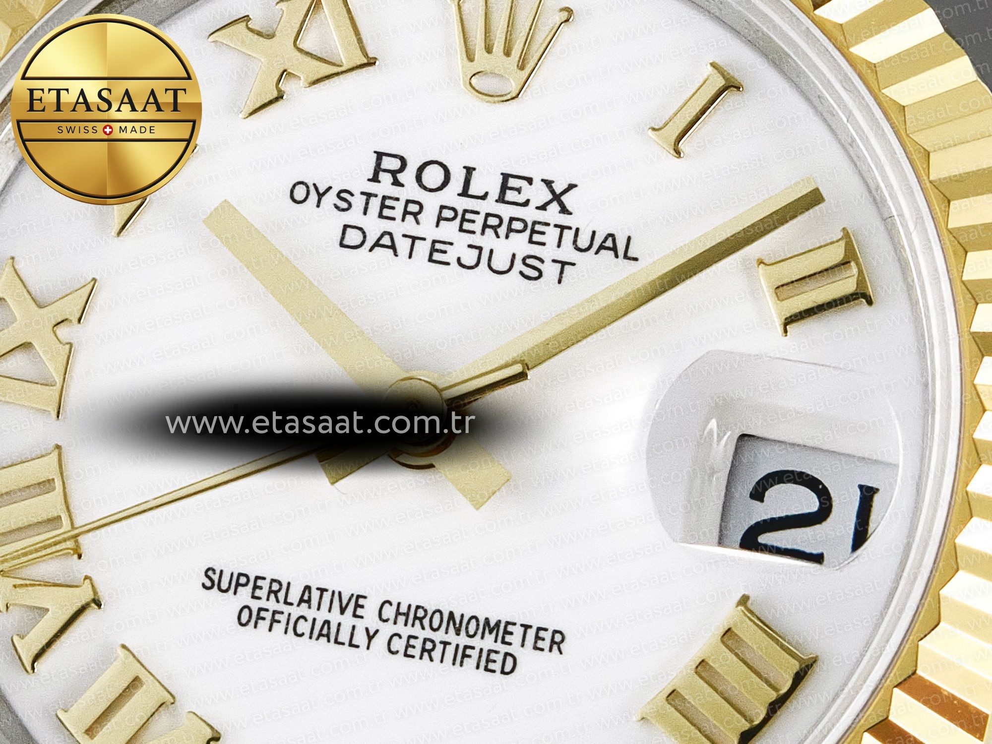 Sarı altın Jubilee bilezik, saatin zarafetini ve lüksünü artırır. Beş parçalı bağlantı tasarımı, bileğe mükemmel bir şekilde oturur ve gün boyu konforlu bir kullanım sağlar. Bileziğin tokası, kolayca açılıp kapanabilir ve güvenli bir şekilde kilitlenir. Beyaz Roma rakamlı kadran, saatin klasik ve zarif görünümünü tamamlar. Roma rakamları, okunabilirliği artırırken, saate sofistike bir dokunuş katar. Kadranın üzerindeki Rolex logosu ve diğer işaretler, orijinaline en yakın detaylarla işlenmiştir.