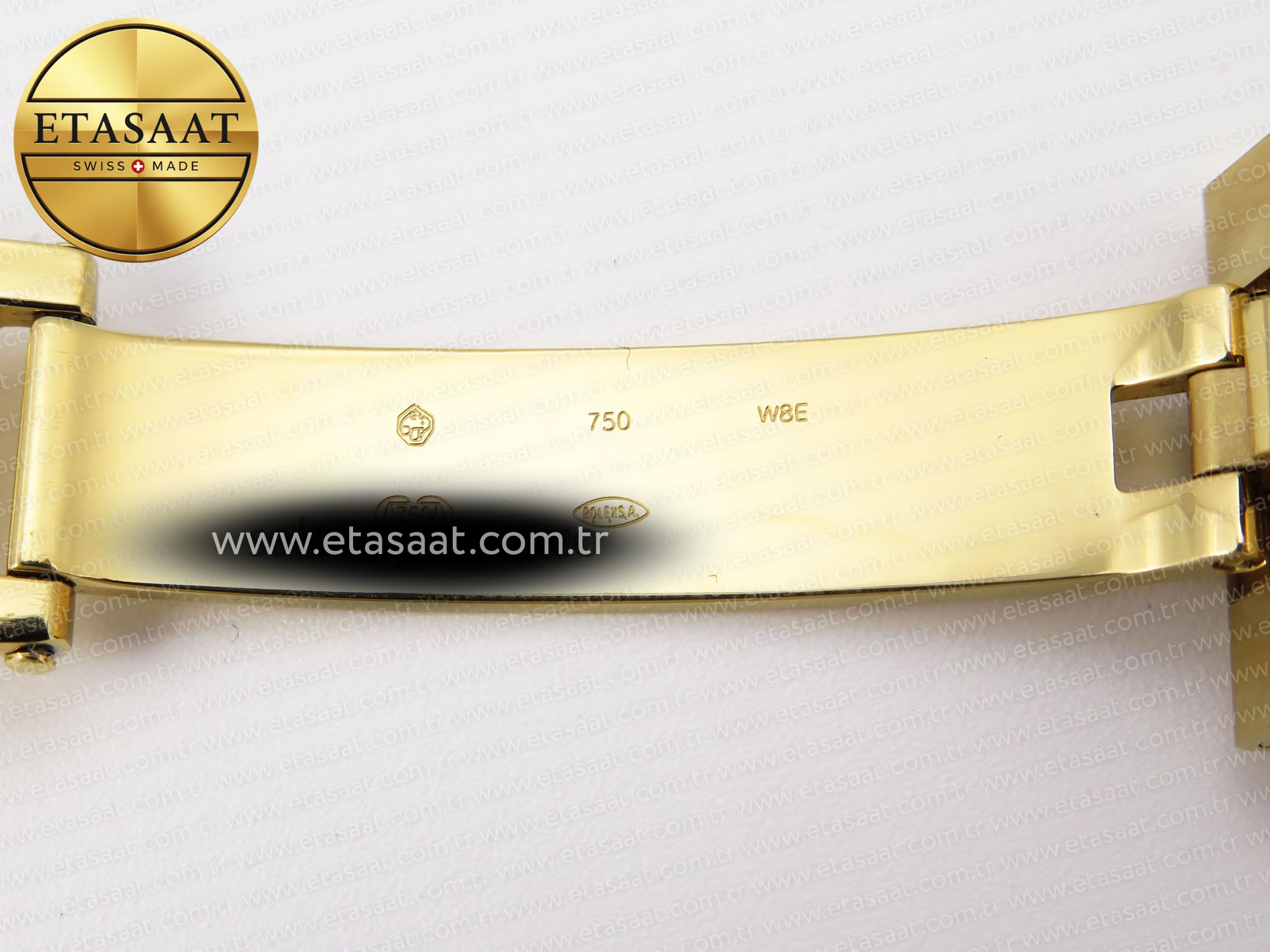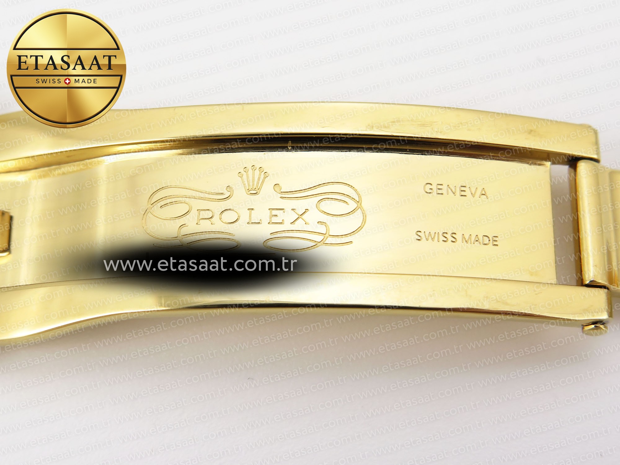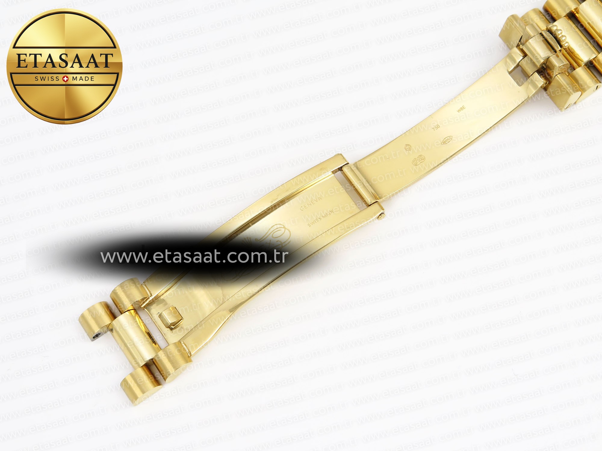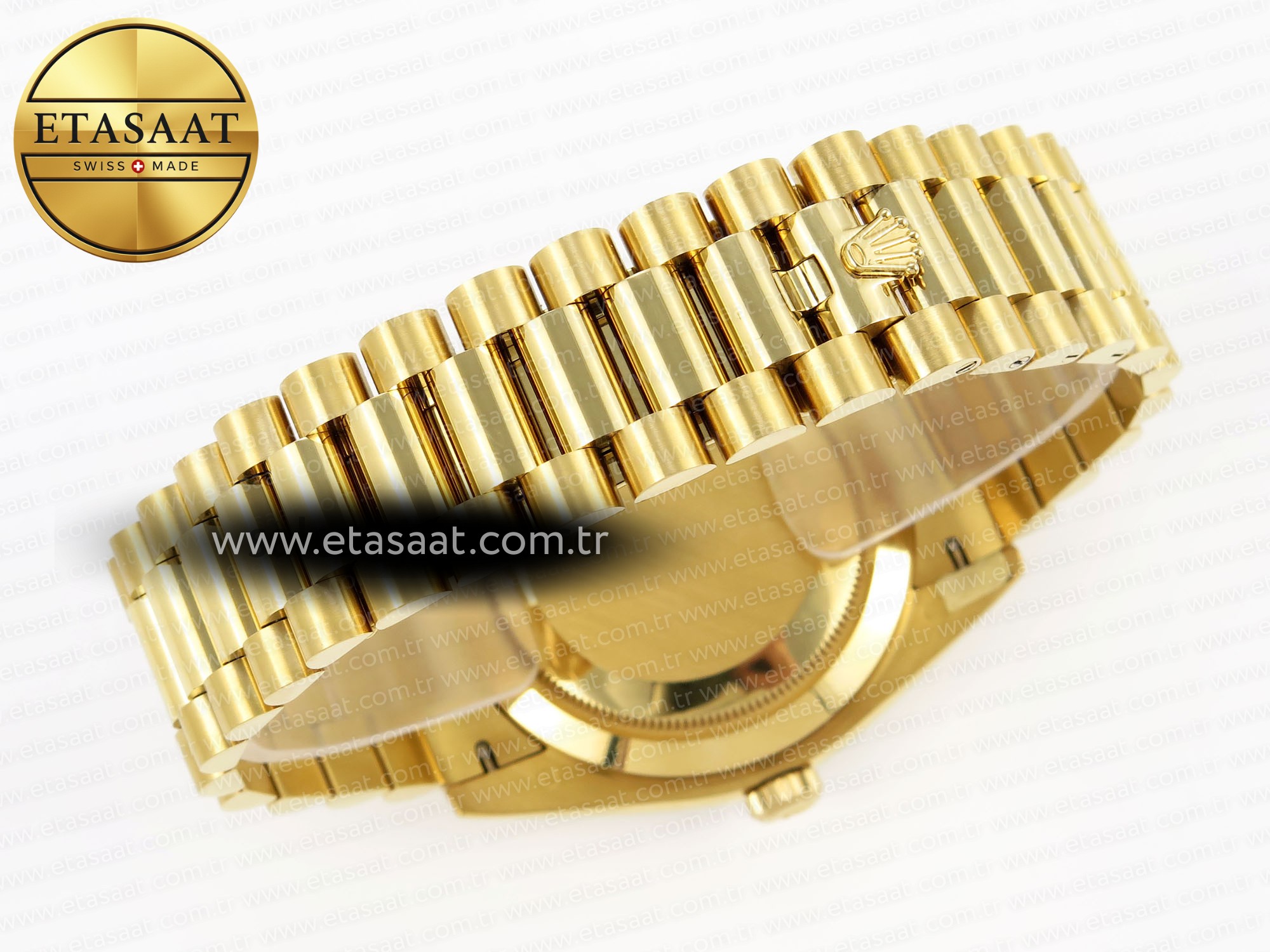 Rolex DayDate 40 YG GSF’nin 18K sarı altın kaplama kasası, saate lüks ve göz alıcı bir görünüm kazandırır. Kasa yapımında kullanılan özel Cu-W metal alaşımı, saatin ağırlığını orijinal Rolex DayDate 40 ile neredeyse aynı seviyeye getirir. Bu sayede, saati taktığınızda gerçek bir Rolex hissi yaşarsınız. Siyah kristal kadran, saate derinlik ve sofistike bir hava katar. Üzerindeki altın renkli indeksler ve ibreler, okunabilirliği artırırken, saate zarif bir dokunuş ekler. Kadranın üzerindeki gün ve tarih göstergeleri, pratik bir kullanım sunar.