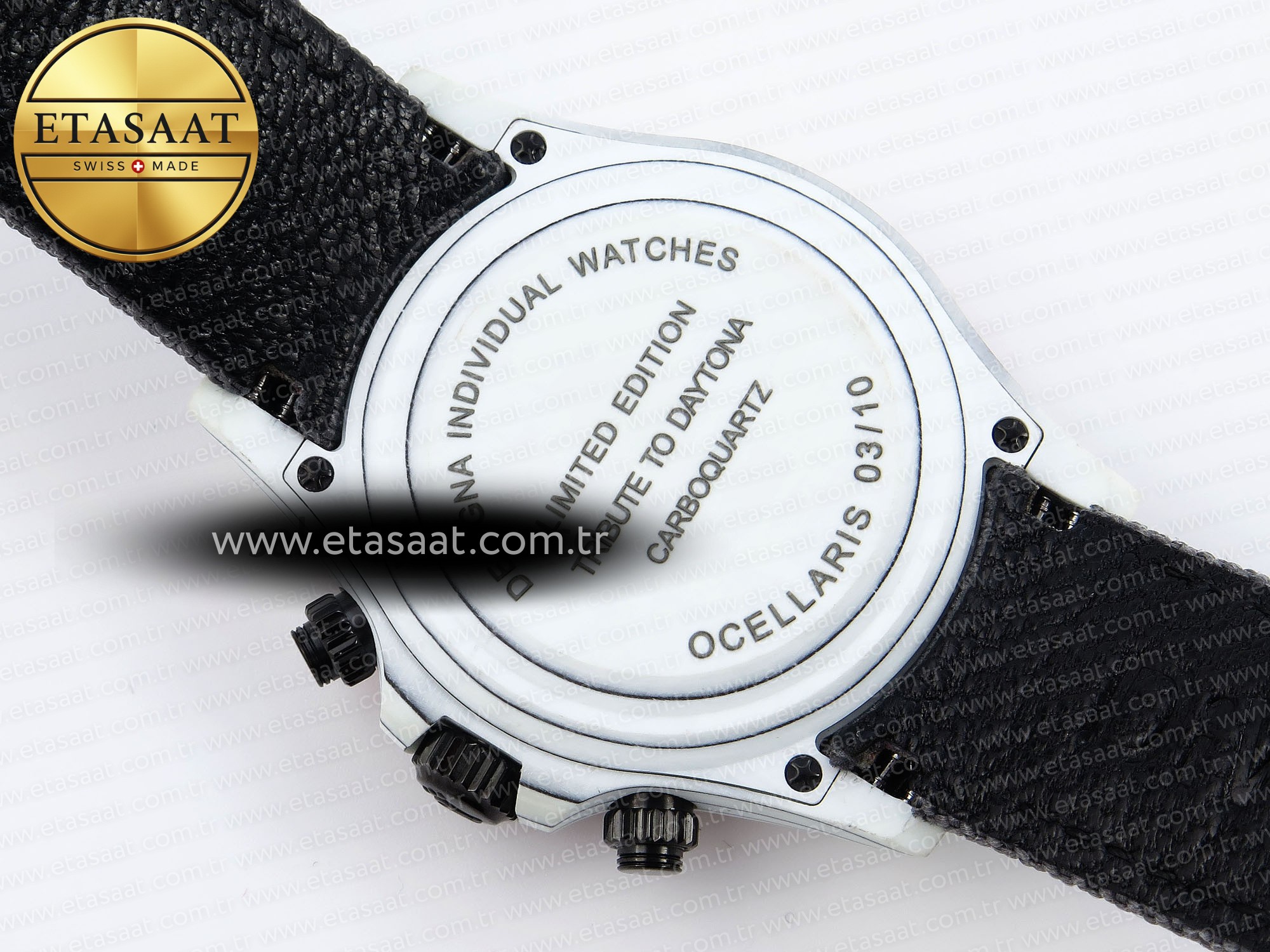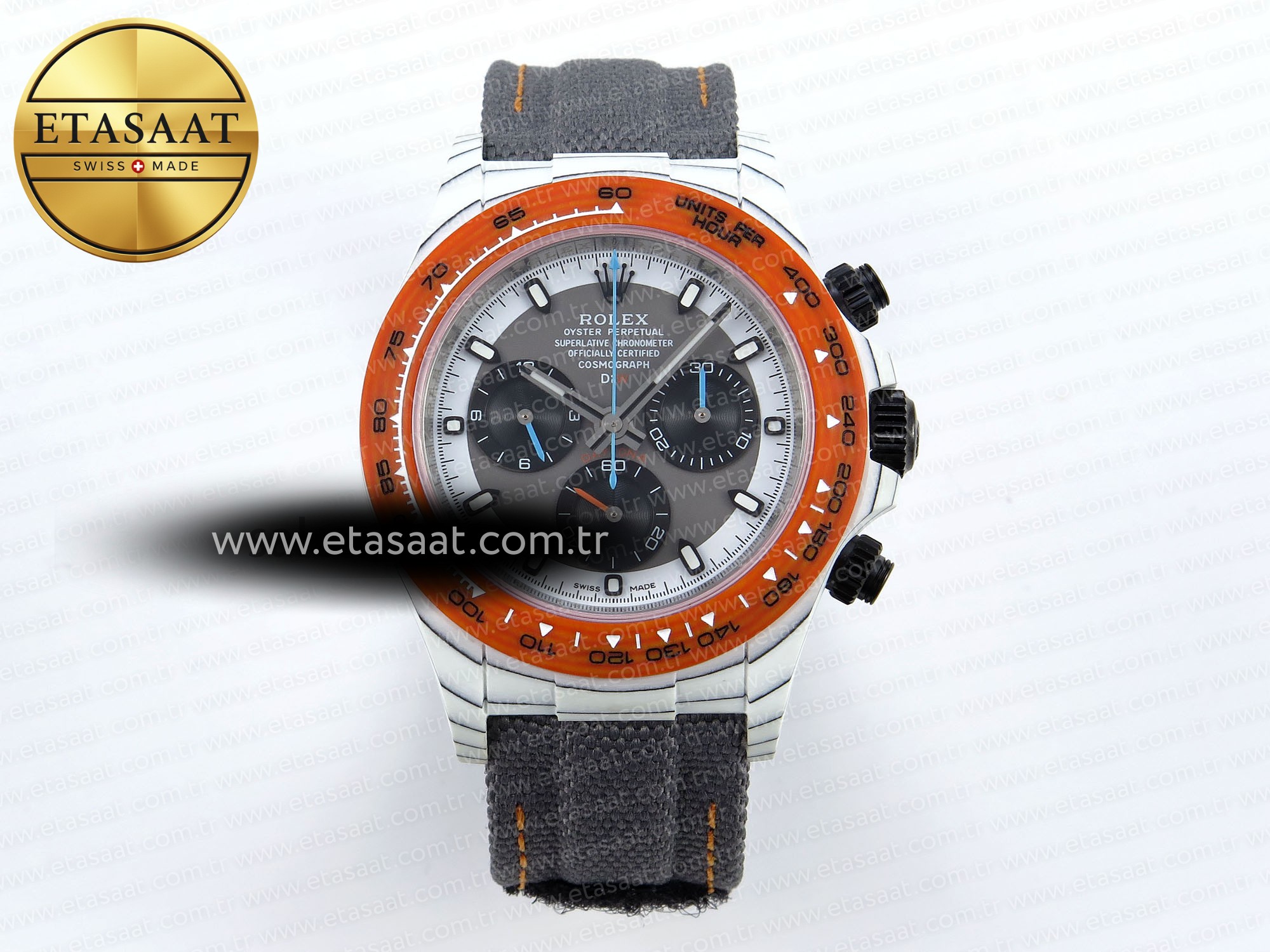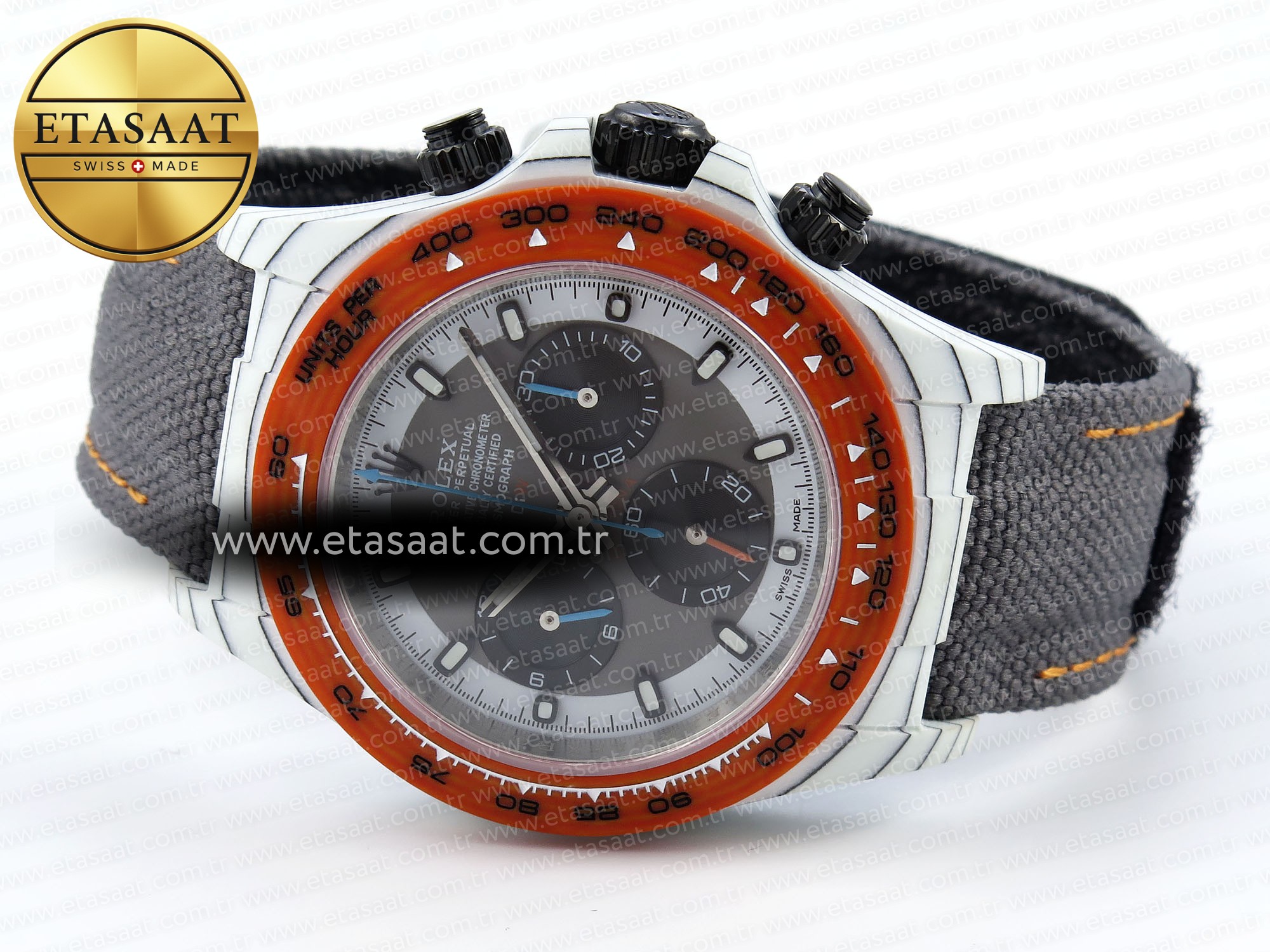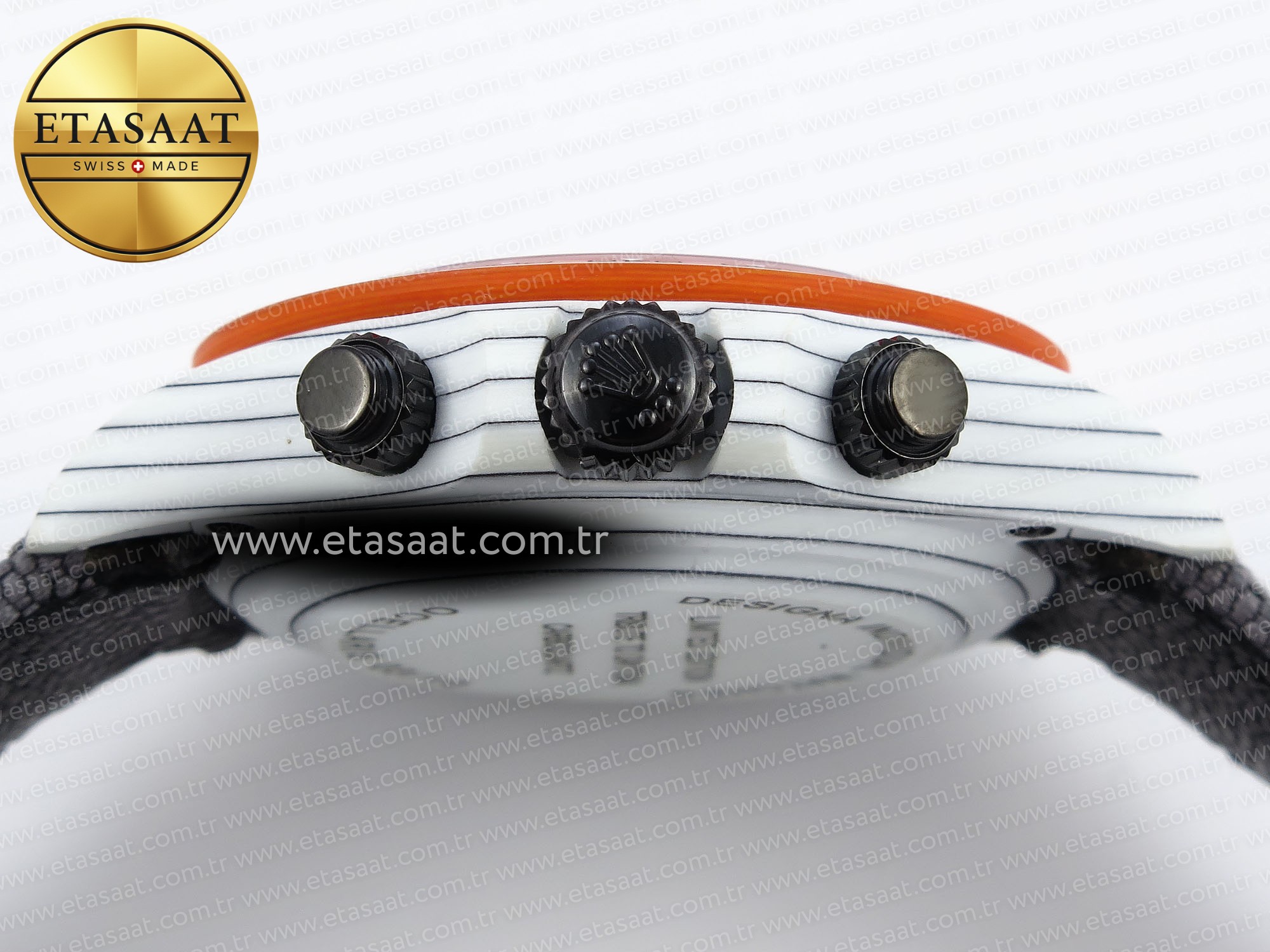 Kasa ve Tasarım: 40mm çapındaki beyaz karbon kasa, saate modern ve sportif bir hava katarken, aynı zamanda hafifliği ile de kullanım kolaylığı sağlar. Karbon malzemenin benzersiz dokusu, her bir saati eşsiz kılar. Turuncu takimetre bezel, saate canlılık katar ve kronograf fonksiyonlarını kullanırken pratik bir yardımcıdır. Kasanın ergonomik tasarımı, bileğinizde rahat bir his sağlar ve uzun süreli kullanımlarda bile konforu garanti eder.
