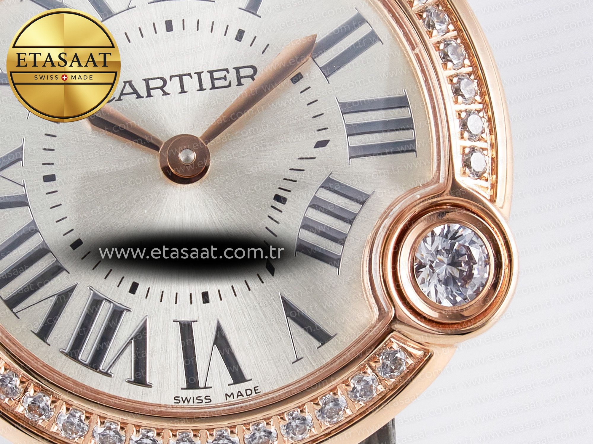 Gümüş dokulu kadran, Cartier Ballon Blanc De Cartier’nin en dikkat çekici özelliklerinden biridir. Bu özel kadran, ışığı mükemmel bir şekilde yansıtarak, saate büyüleyici bir parlaklık kazandırır. Dokulu yüzey, kadrana derinlik ve boyut katarken, okunabilirliği de artırır. Pırlanta bezel, saate lüks ve ihtişamlı bir dokunuş ekler. Her bir pırlanta, özenle seçilmiş ve yerleştirilmiş olup, saate benzersiz bir ışıltı verir. Bu kadran ve bezel kombinasyonu, saati adeta bir mücevhere dönüştürür.