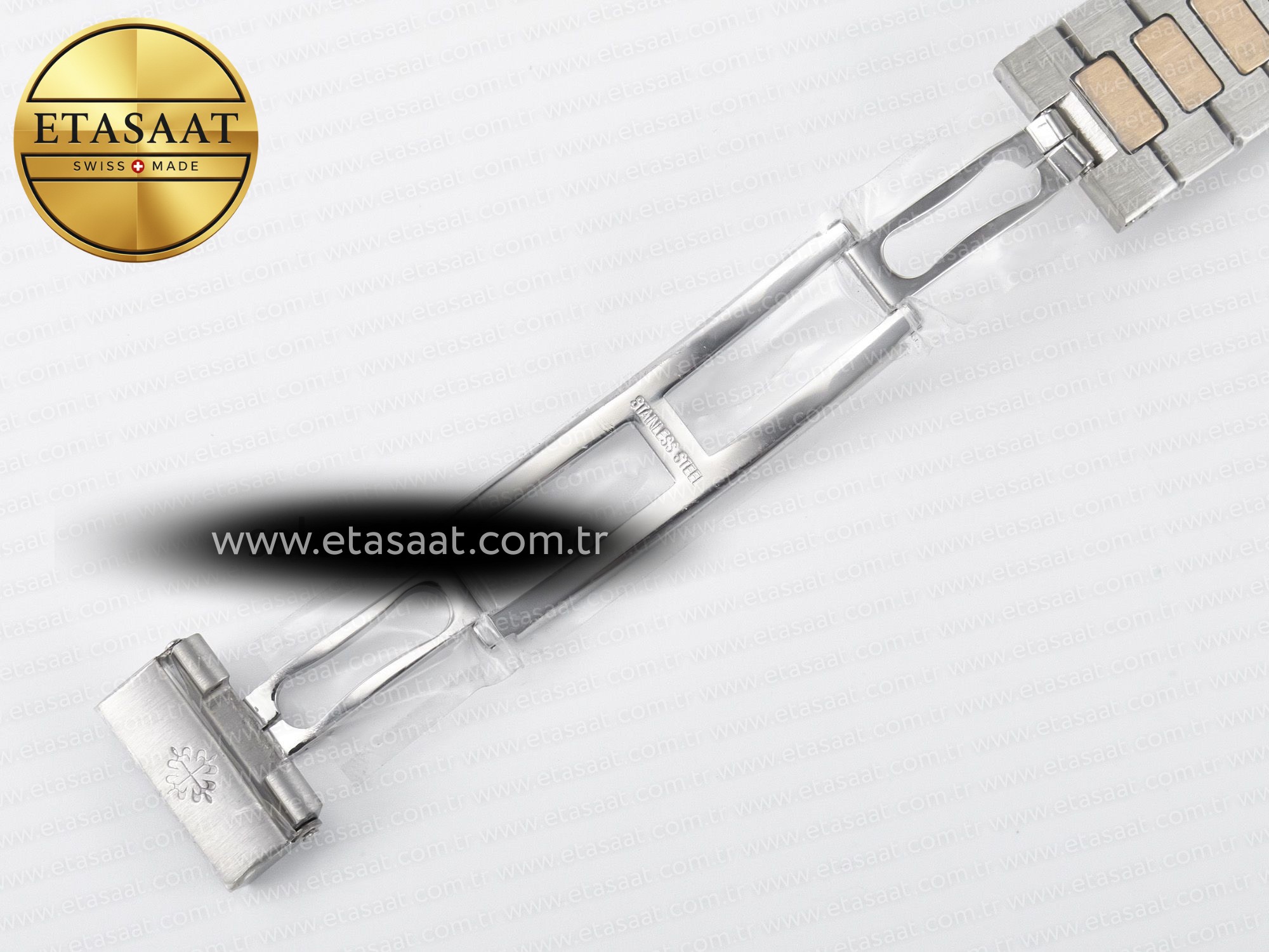 Patek Philippe Nautilus 5980’in kasası, paslanmaz çelik ve rose gold’un mükemmel birleşimiyle üretilmiştir. Bu kombinasyon, saate hem modern hem de klasik bir görünüm kazandırır. Kasanın 40.5mm çapı, bileğinizde zarif ve dengeli bir duruş sergilerken, rose gold detaylar saate lüks bir dokunuş katıyor. Kasanın yüzeyi, çizilmelere karşı dayanıklı ve uzun ömürlü olması için özel olarak işlenmiştir. Paslanmaz çelik ve rose gold bilezik, kasanın tasarımını tamamlar ve bileğinizde konforlu bir kullanım sunar. Bileziğin tokası, güvenli ve kolay bir şekilde açılıp kapanabilir.