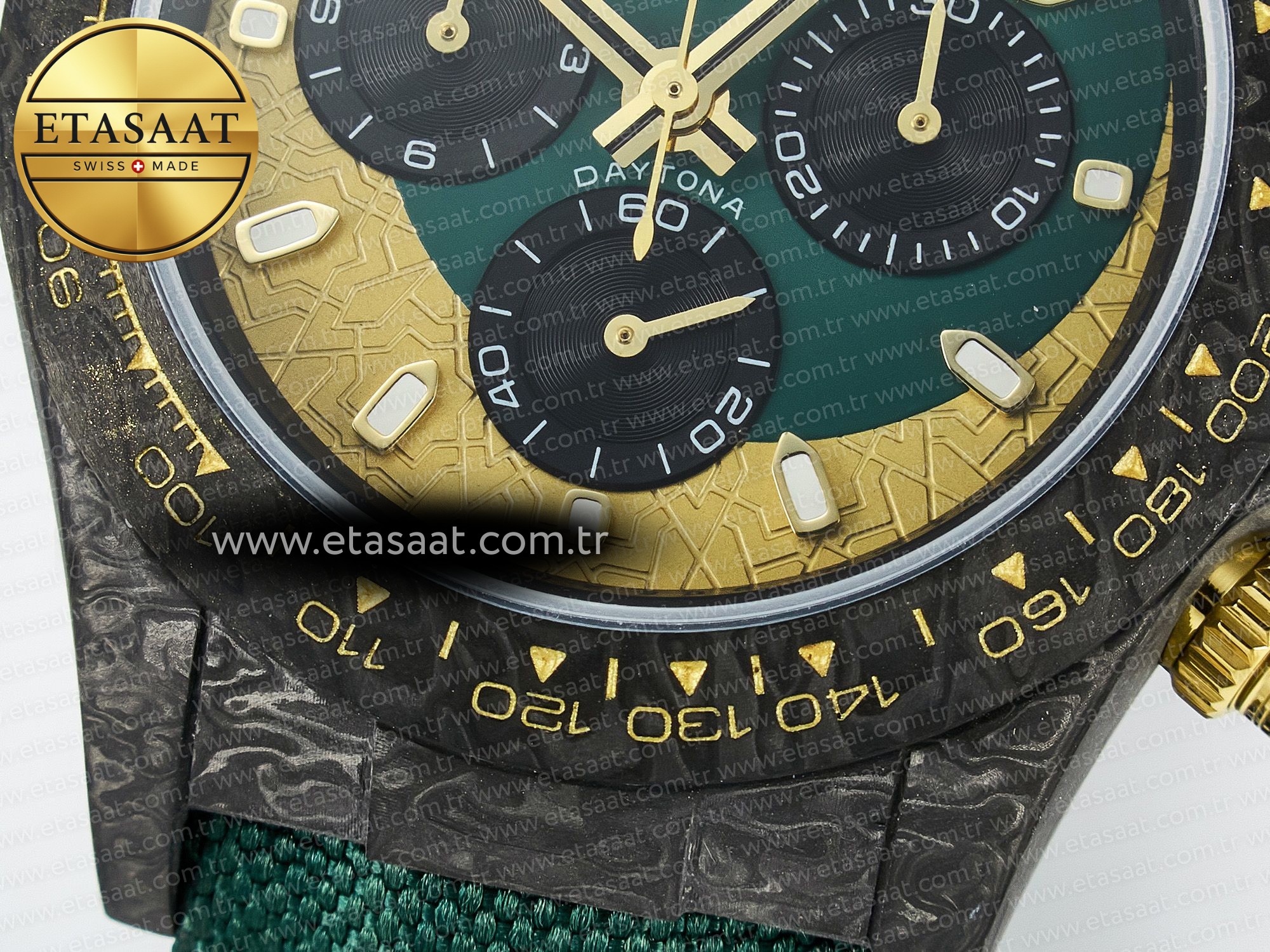 Yeşil ve altın renkli kadran, Rolex Daytona DIW Carbon’un en dikkat çekici özelliklerinden biridir. Bu renk kombinasyonu, saate lüks ve zarif bir görünüm kazandırırken, aynı zamanda okunabilirliği artırır. Altın rengi indeksler ve ibreler, yeşil zemin üzerinde kolayca fark edilir ve saatin zamanı net bir şekilde göstermesini sağlar. Kadranın detaylı işçiliği, Rolex’in mükemmeliyetçi yaklaşımını yansıtır.