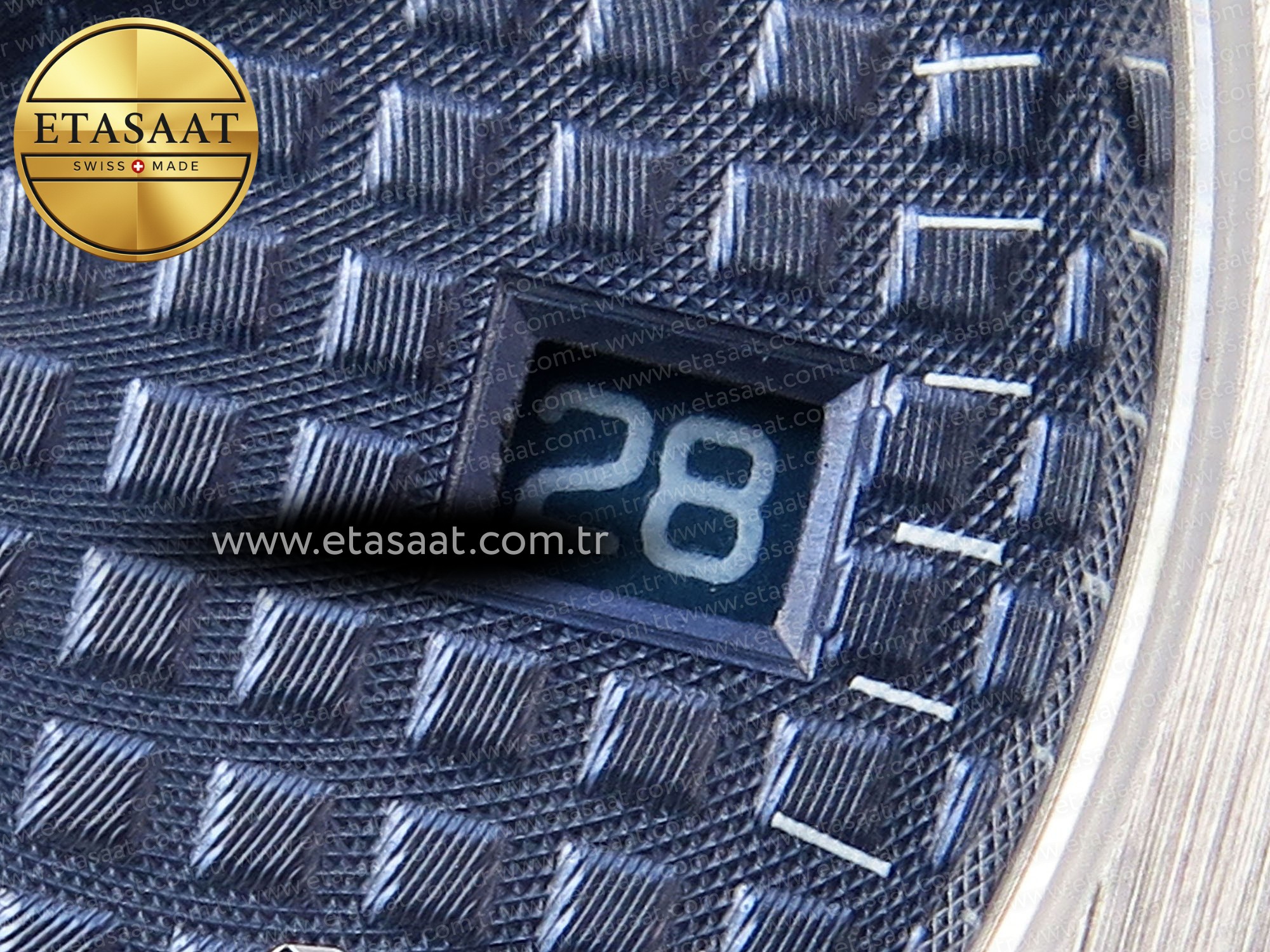 Kadran: Mavi dokulu kadran, bu saatin en dikkat çekici özelliklerinden biridir. Kadranın derin ve zengin mavi tonu, ışığın altında farklı açılardan parlayarak büyüleyici bir etki yaratır. Royal Oak’ın karakteristik “Tapisserie” deseni, kadrana derinlik ve boyut kazandırır. Işıltılı baton indeksler ve ibreler, karanlıkta bile kolayca okunabilirlik sağlar. Tarih göstergesi, pratik bir özellik sunarken, kadranın genel estetiğini bozmaz. Bu kadran, sadece zamanı göstermekle kalmaz, aynı zamanda bir sanat eseri niteliğindedir.