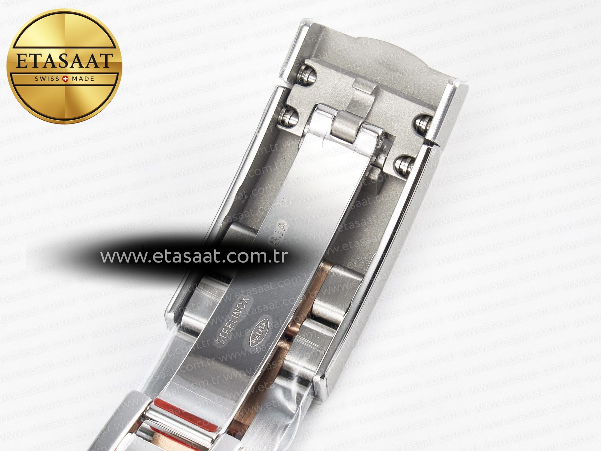 Strap: Stainless steel bracelet with 18k rose gold plated middle links