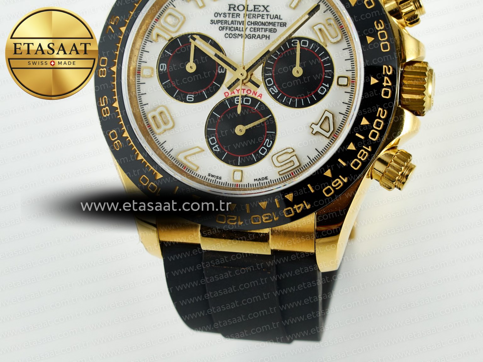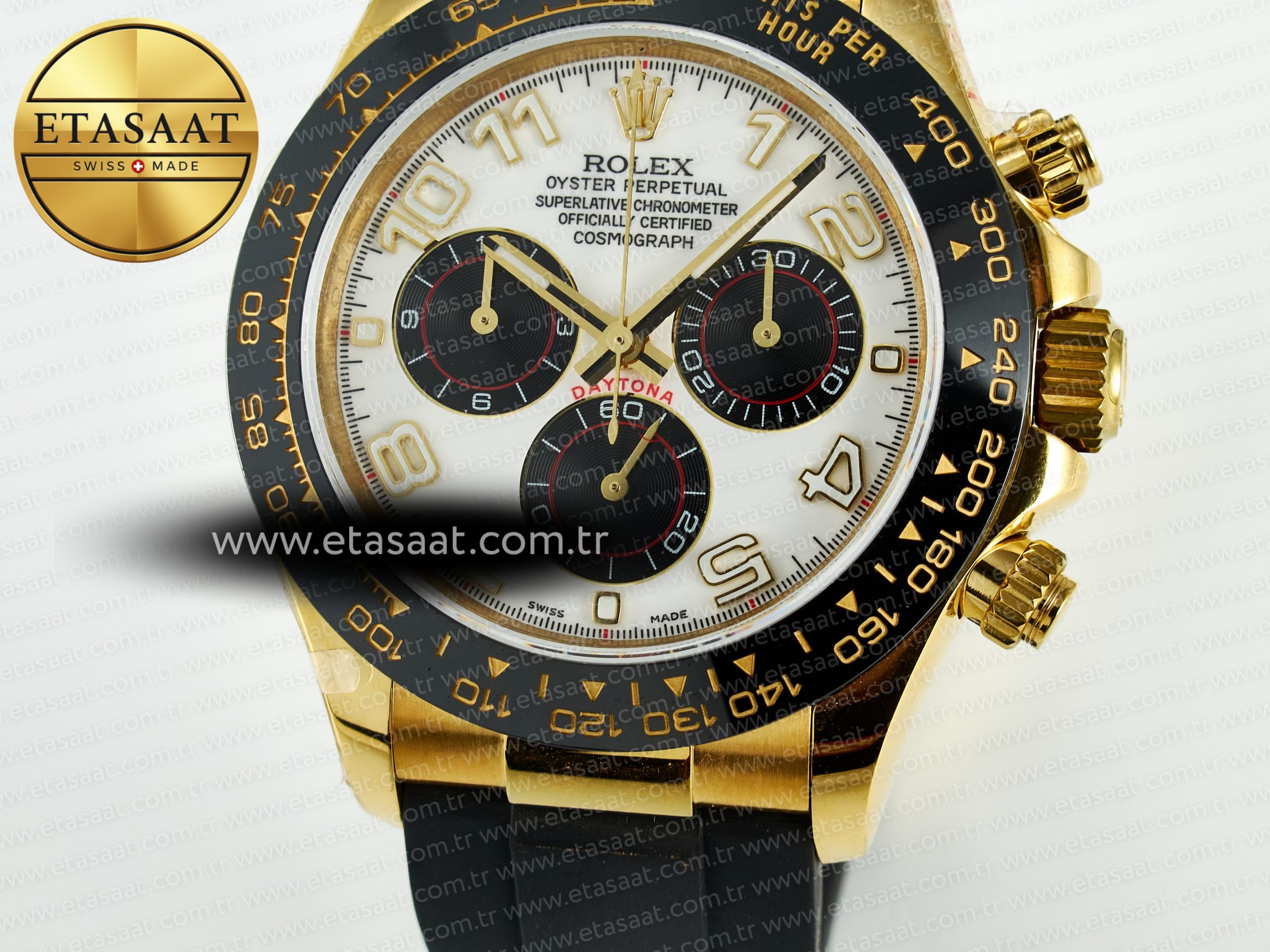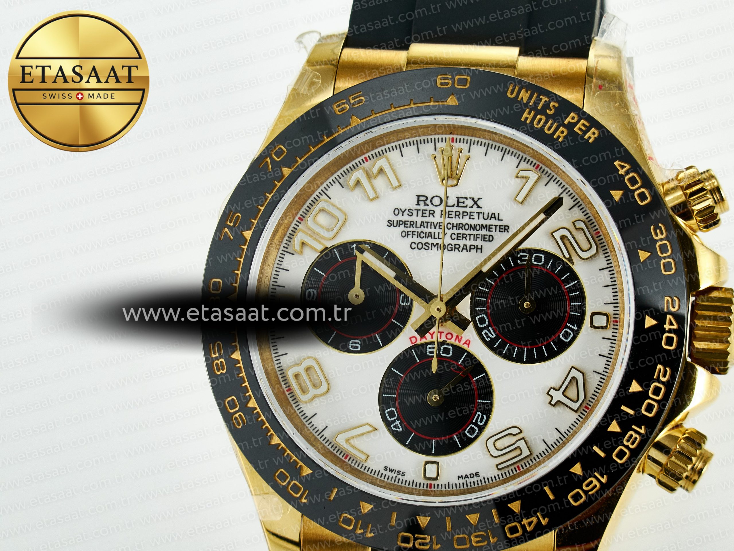 Bezel: Black ceramic tachymeter bezel, real gold plated correct markers, same shape and depth as genuine bezel