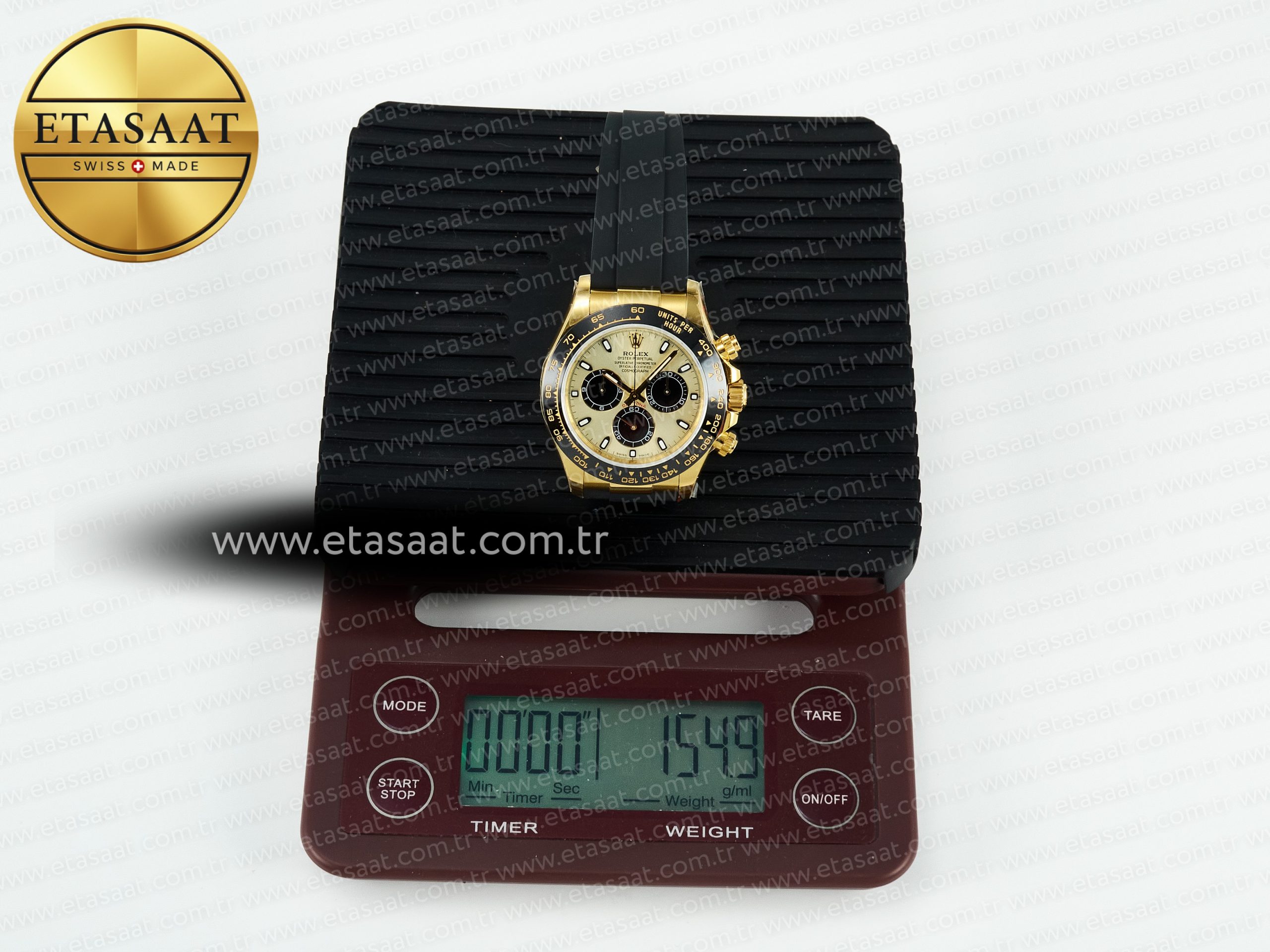 Bezel: Black ceramic tachymeter bezel, real gold plated correct markers, same shape and depth as genuine bezel