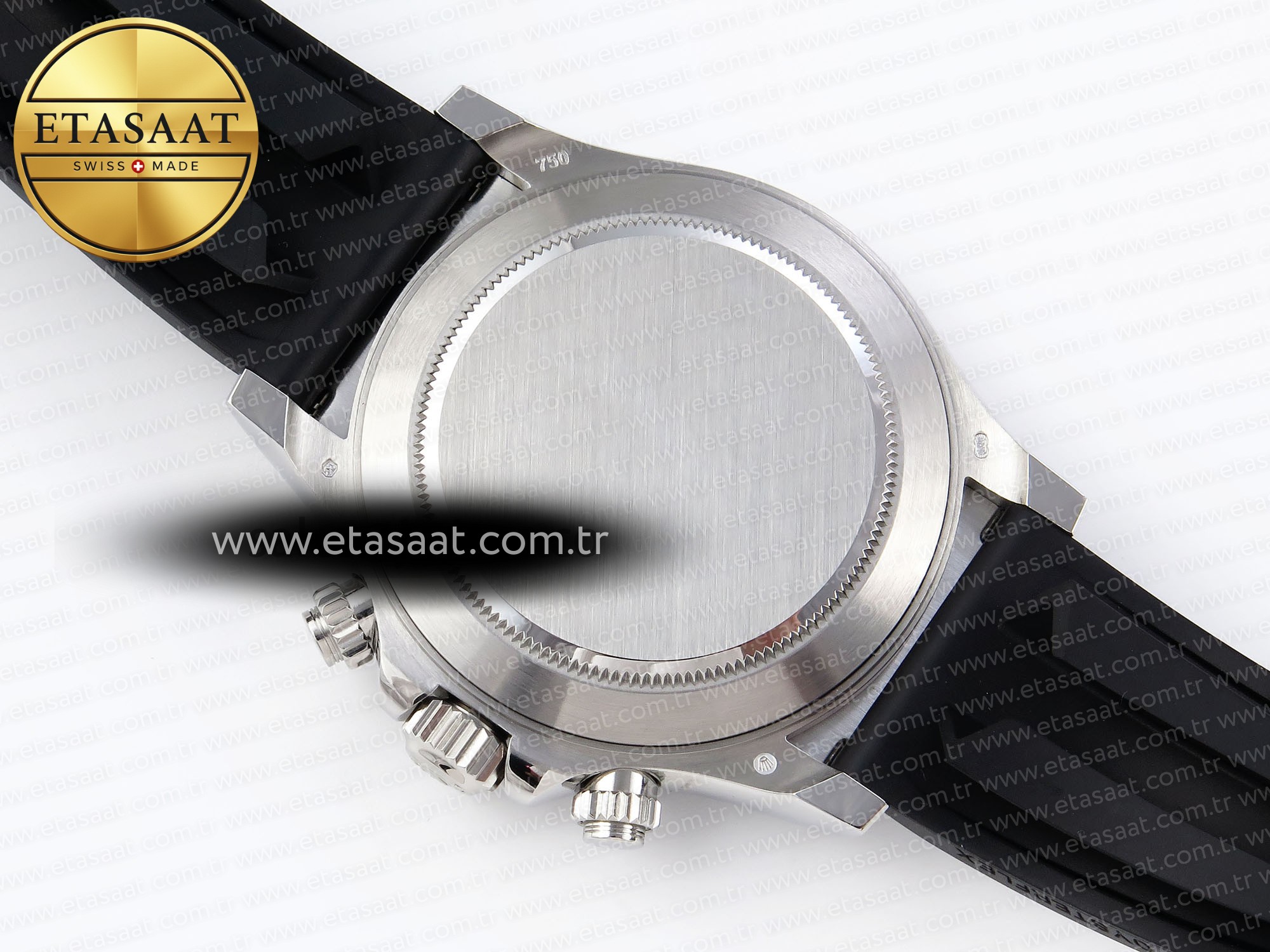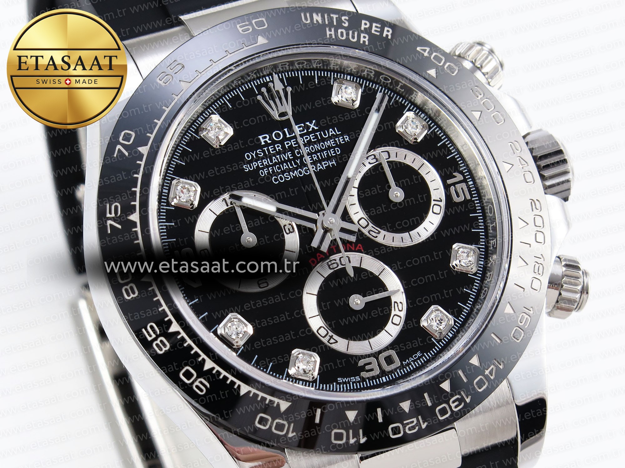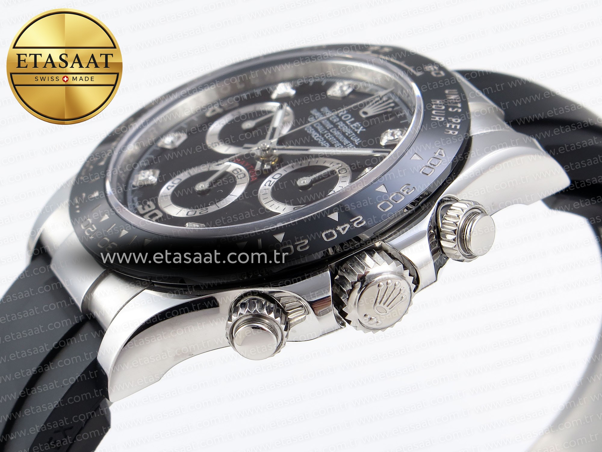 Bezel: Black ceramic tachymeter bezel, real platinum plated correct markers, same shape and depth as genuine bezel