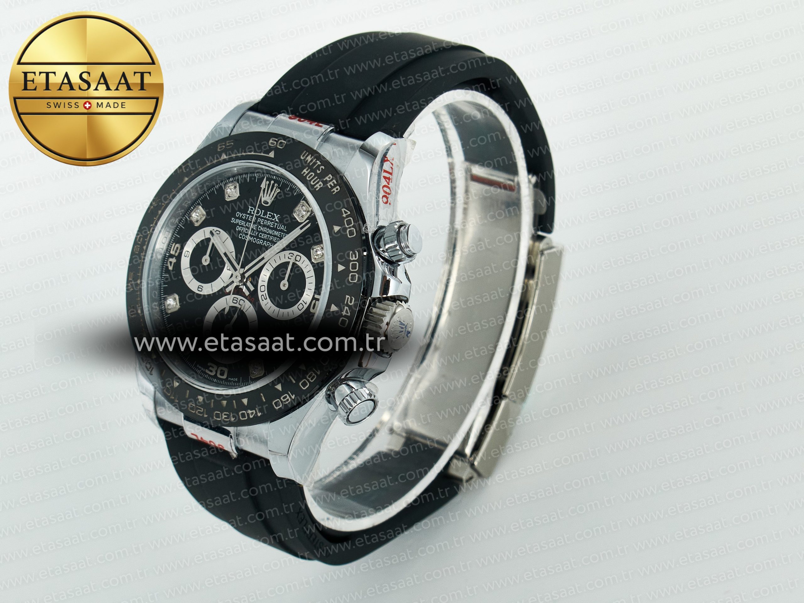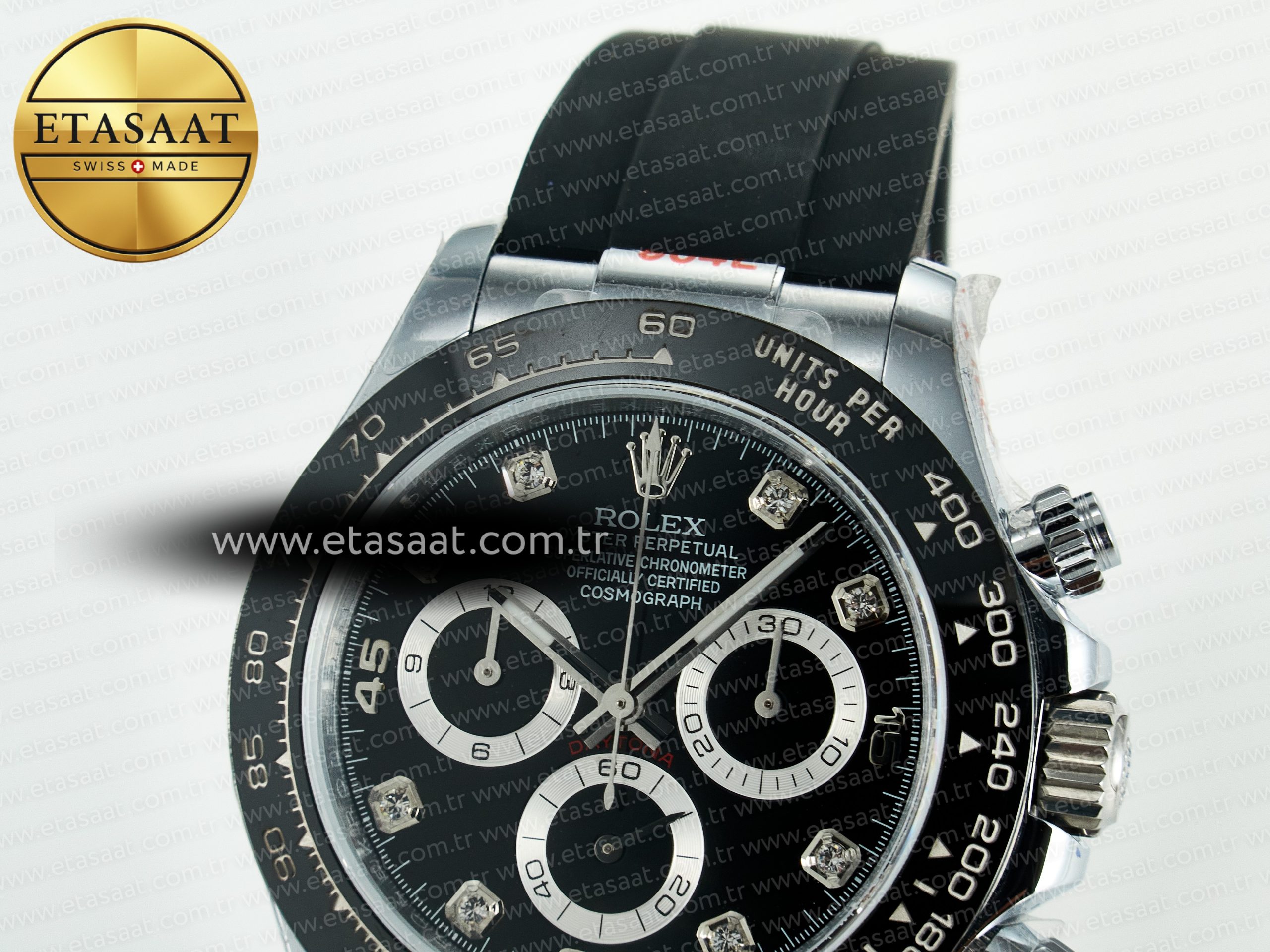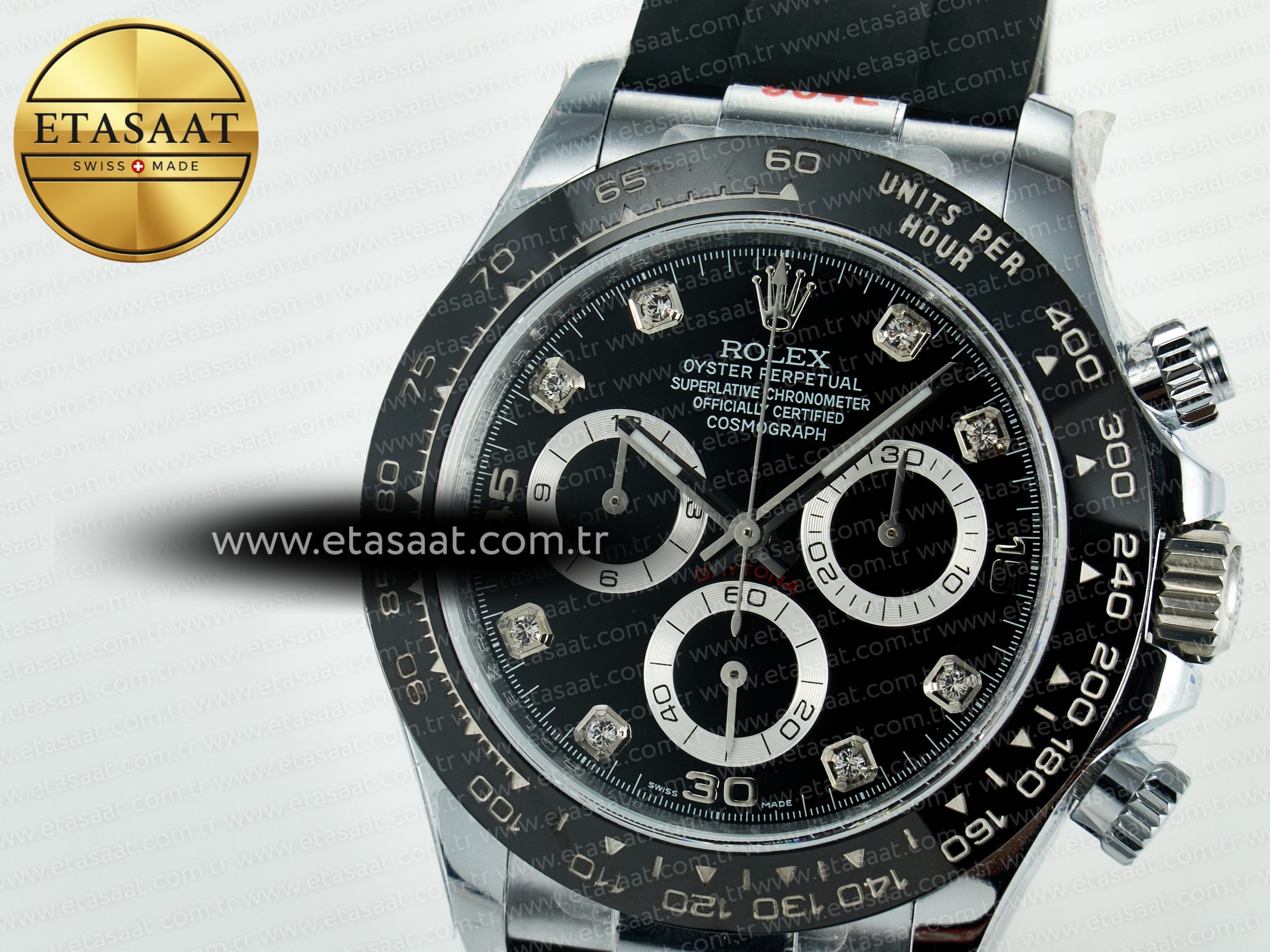 Bezel: Black ceramic tachymeter bezel, real gold plated correct markers, same shape and depth as genuine bezel