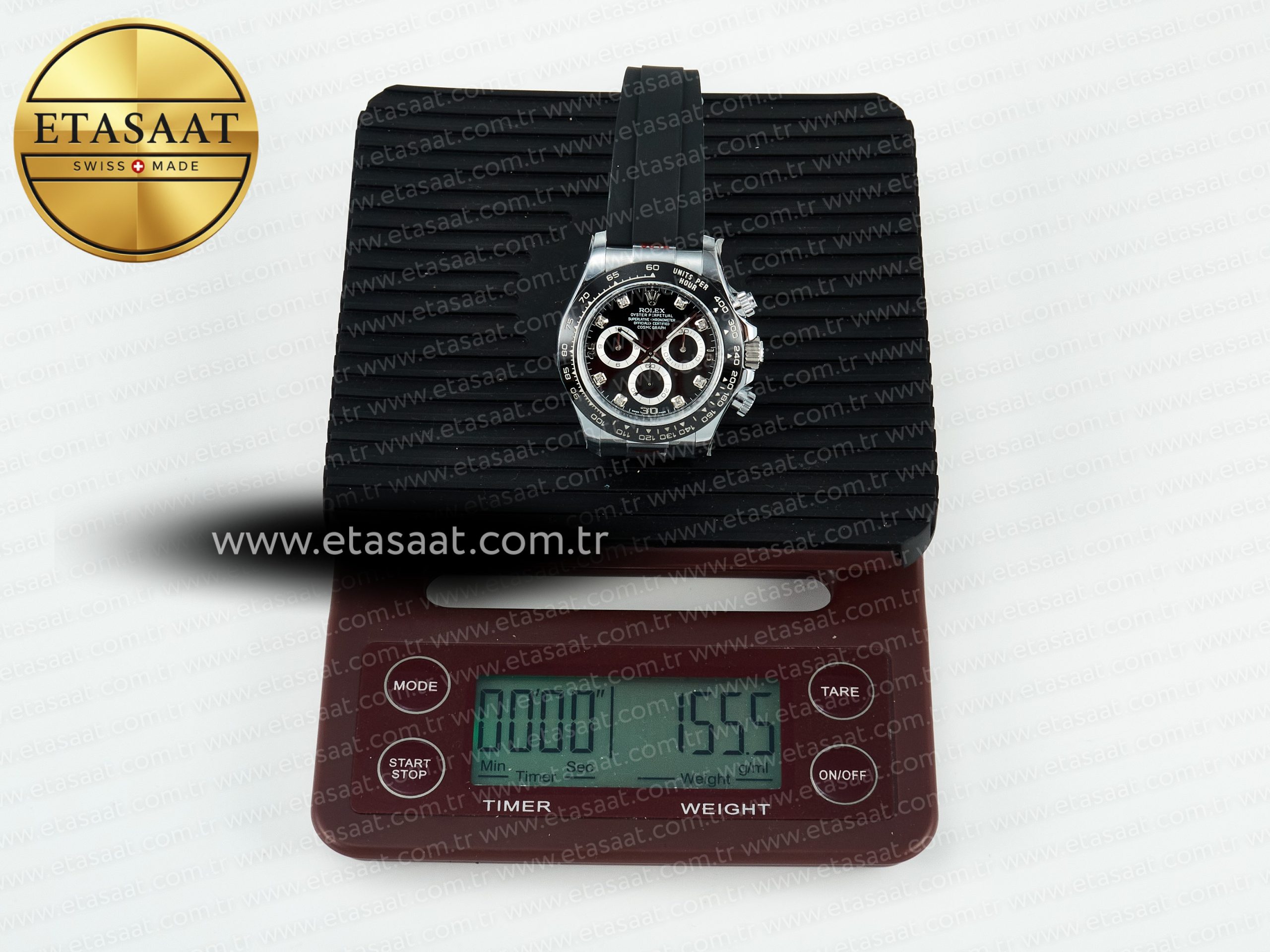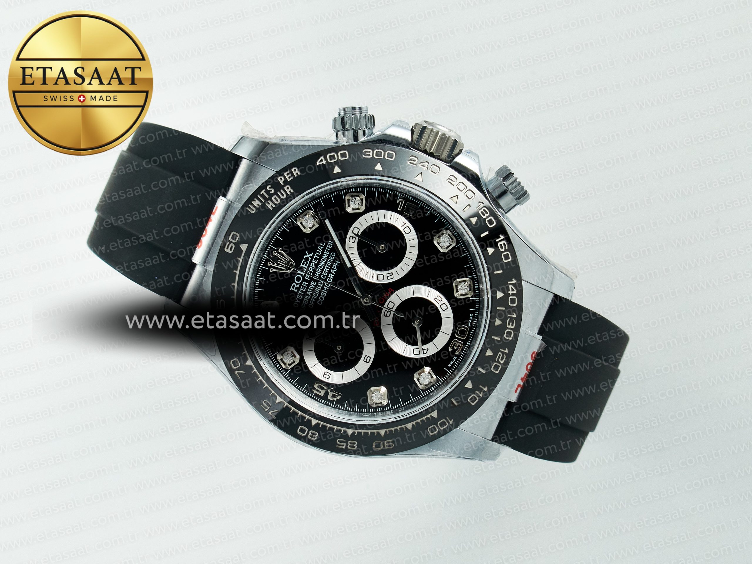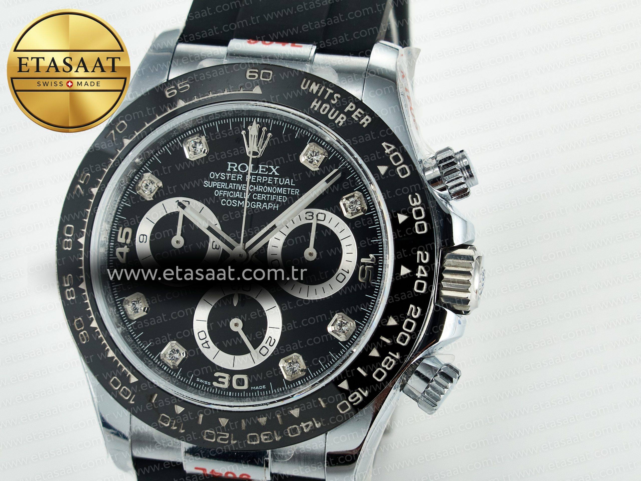 Bezel: Black ceramic tachymeter bezel, real gold plated correct markers, same shape and depth as genuine bezel