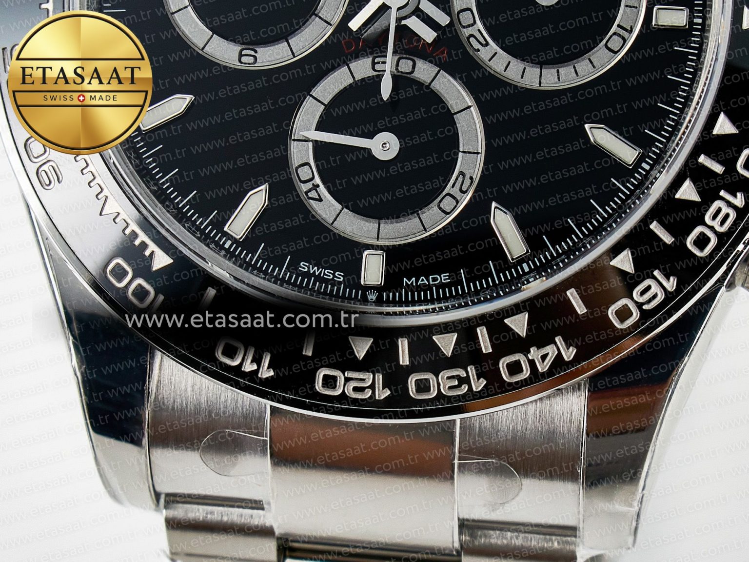 Bezel: Black ceramic tachymeter bezel with steel wrapped