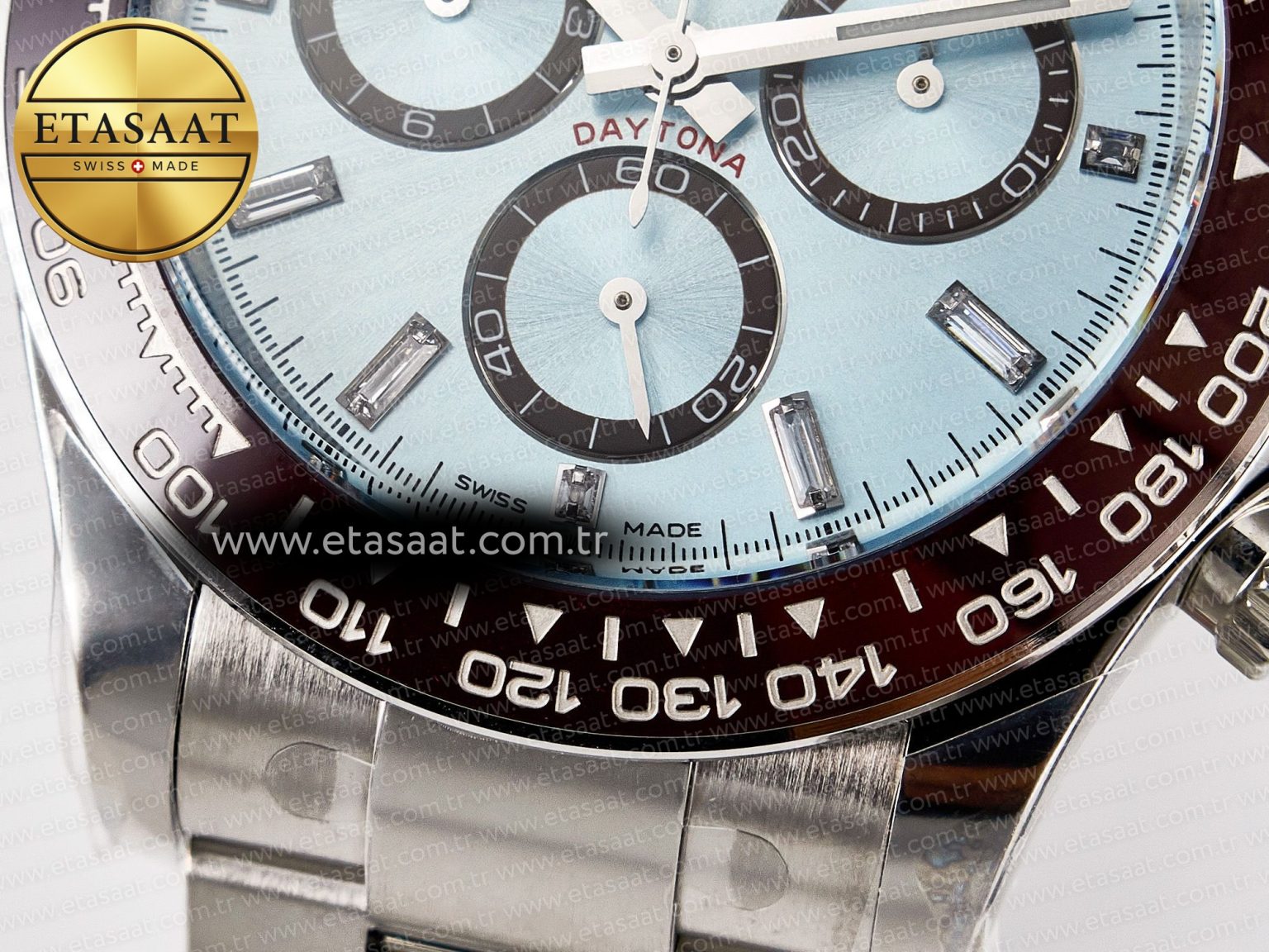 Bezel: Brown ceramic tachymeter bezel with steel wrapped