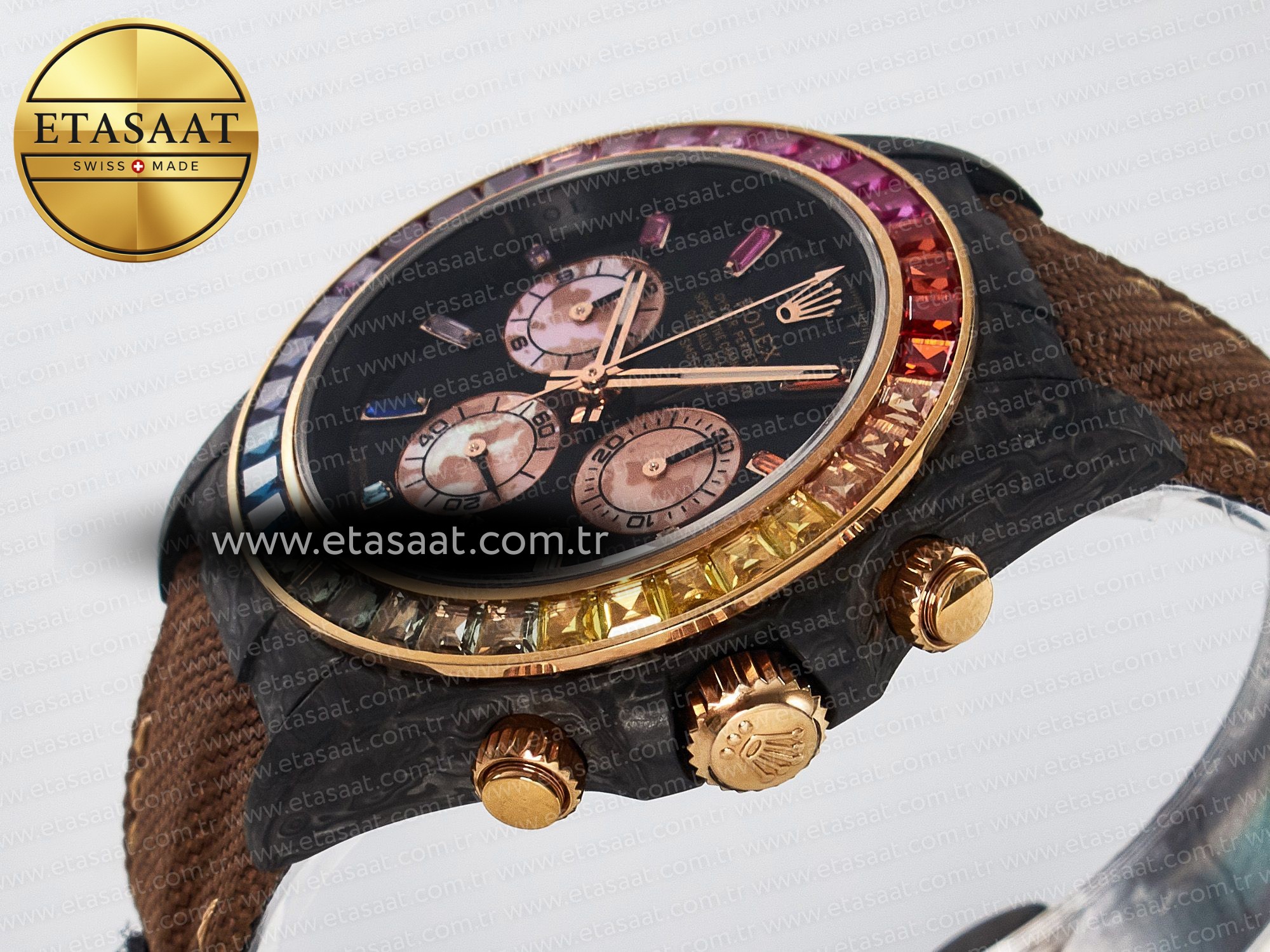 Daytona DIW Carbon Case DIWF Edition Black Dial Rainbow Diamonds Bezel on Brown Nylon Strap A7750