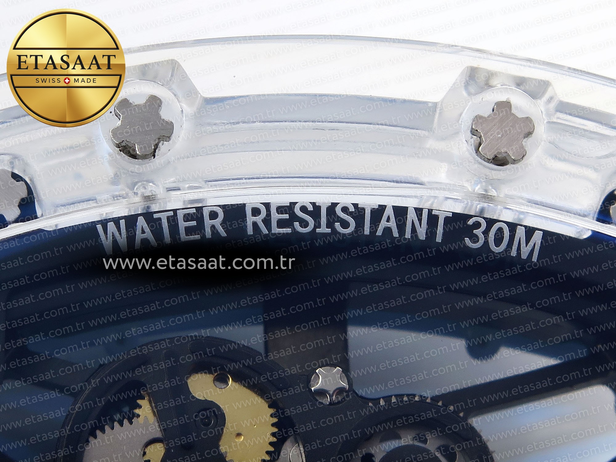 - Şeffaf Kompozit Kasa: Saatin iç mekanizmasını gözler önüne seren, dayanıklı ve hafif malzeme.