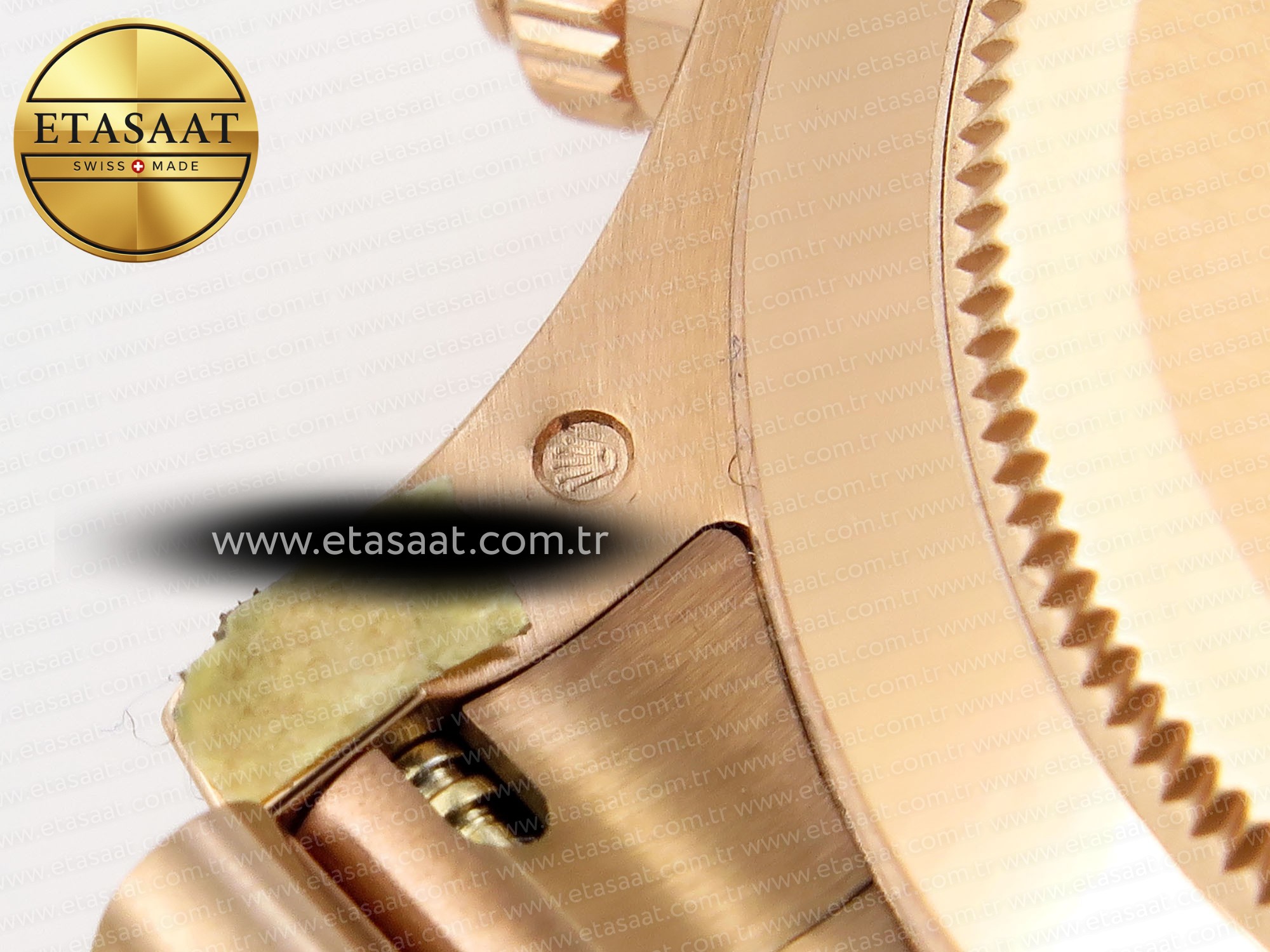 Saatin kasası, 18k rose gold kaplama 904L paslanmaz çelikten üretilmiştir. Bu malzeme, dayanıklılığı ve korozyona karşı direnci ile bilinir. Kasanın 40mm çapı, hem erkek hem de kadın bilekleri için ideal bir boyuttadır. Kasanın üzerindeki takimetre bezel, saate sportif ve şık bir görünüm kazandırır. Kadran üzerindeki siyah pırlantalar, saate lüks ve sofistike bir dokunuş katarken, okunabilirliği de artırır. Saatin kristali, çizilmeye karşı dayanıklı safir kristalden yapılmıştır ve saat 6 yönünde yarı görünmez bir taç gravürü bulunur, bu da orijinal Rolex saatlerinde bulunan bir özelliktir.