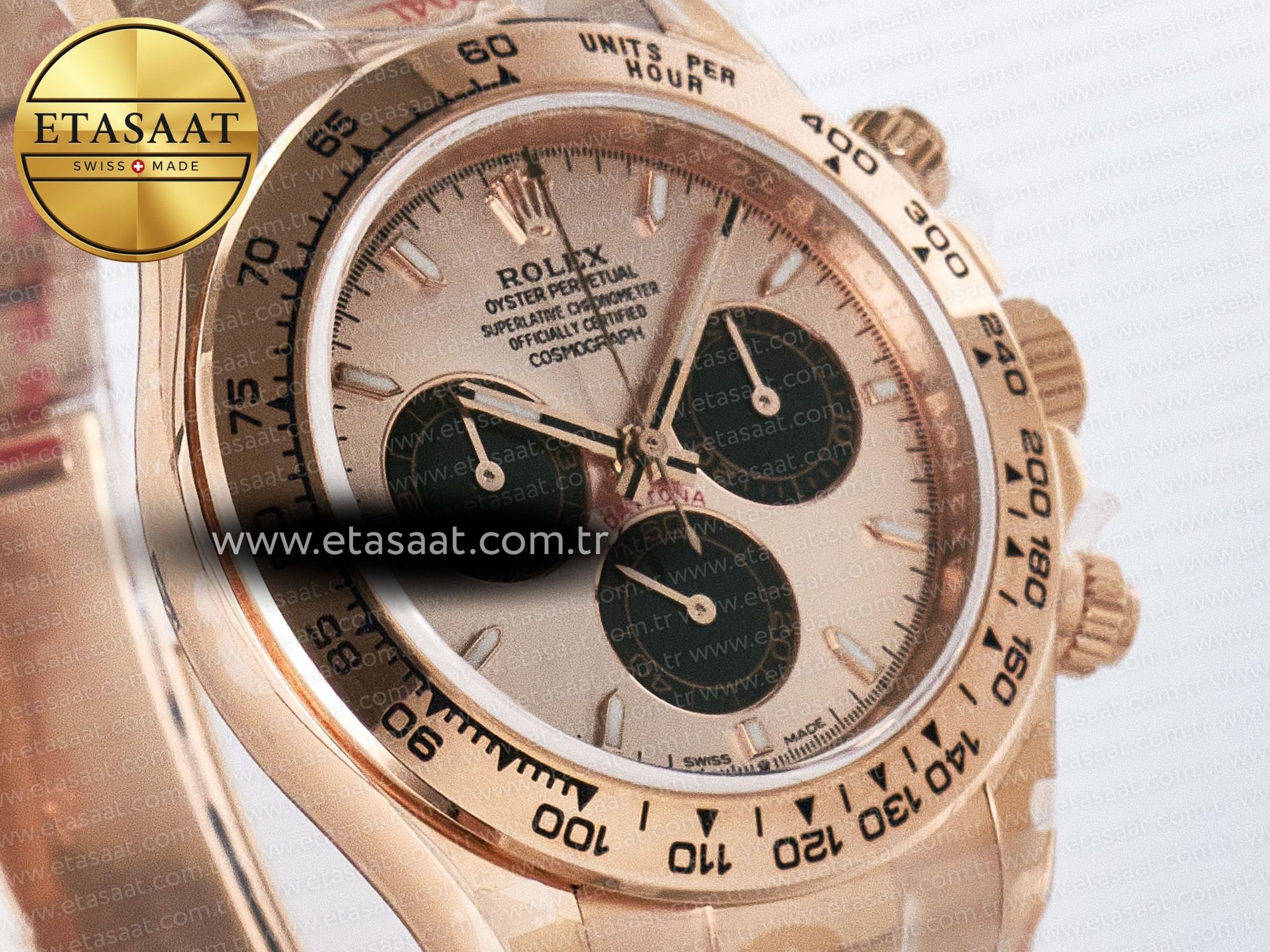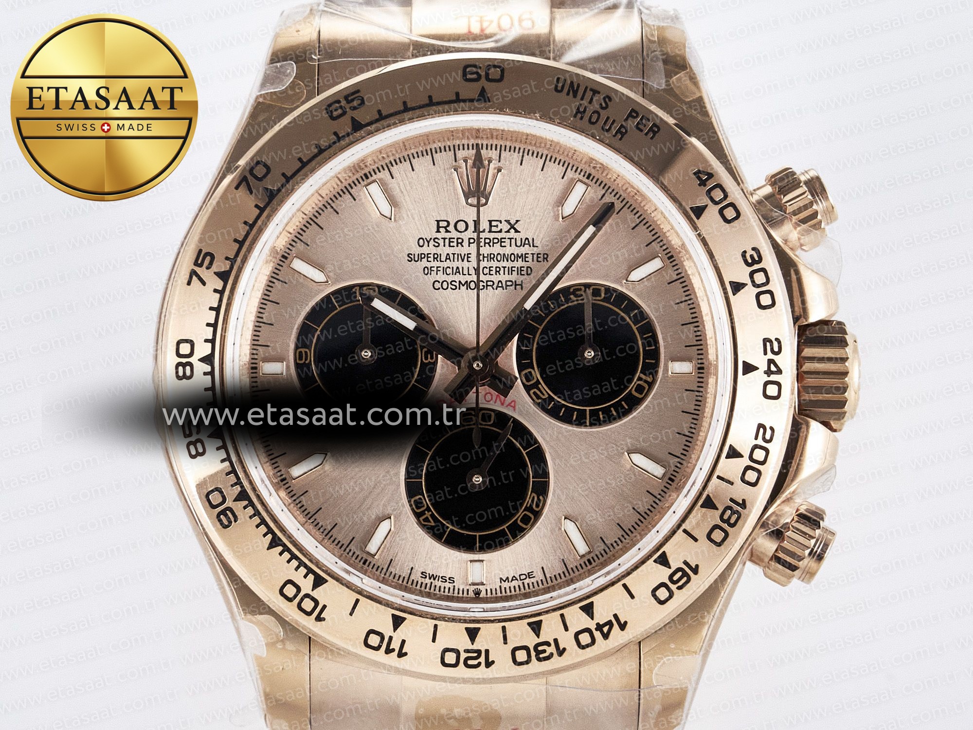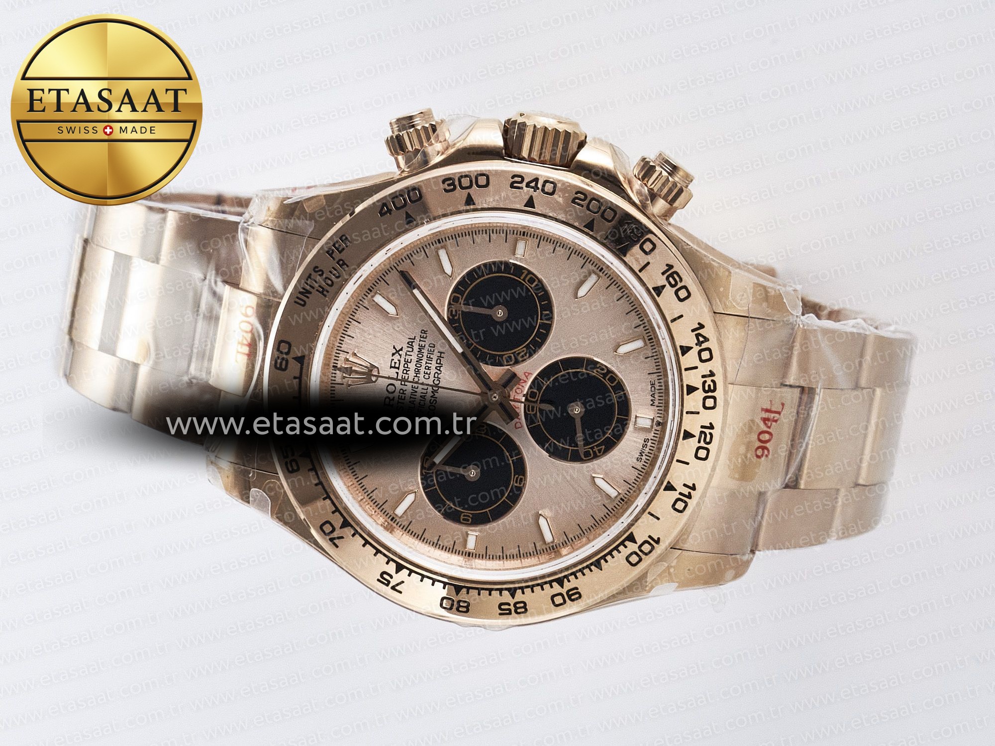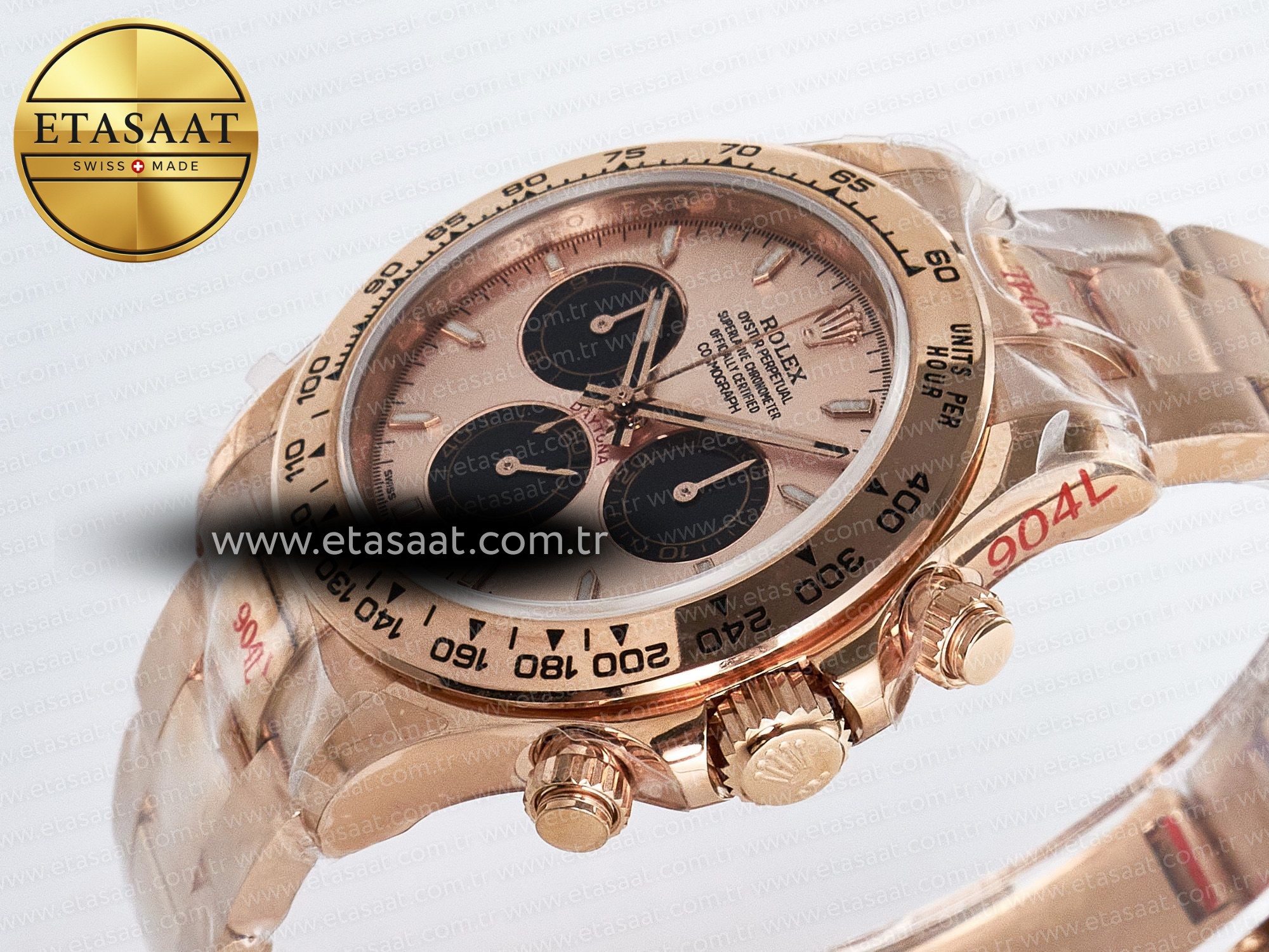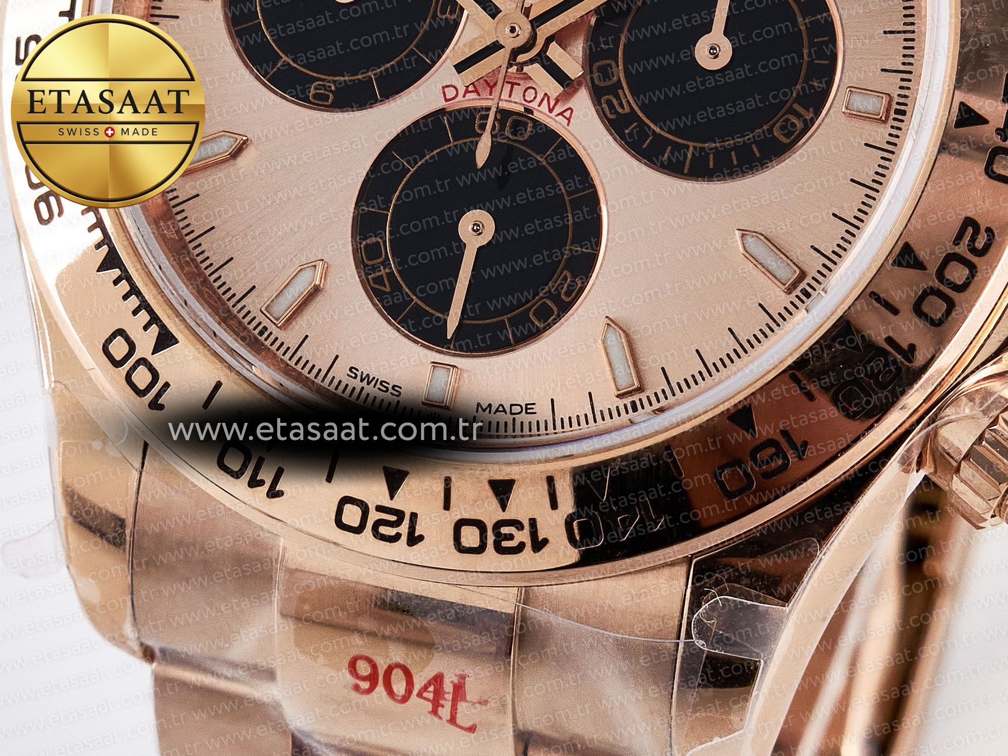 Saatin kasası, 18k pembe altın kaplama 904L paslanmaz çelikten üretilmiştir. 904L paslanmaz çelik, Rolex tarafından da kullanılan ve korozyona karşı yüksek direnç gösteren bir malzemedir. Bu sayede, saatiniz uzun yıllar boyunca ilk günkü parlaklığını korur. Kasanın 1:1 replikası olması, orijinal Rolex Daytona ile arasındaki farkı anlamayı neredeyse imkansız hale getirir. Kasanın detayları, ölçüleri ve ağırlığı, orijinaline birebir uygundur. Bu da saatin genel görünümüne ve hissine büyük bir katkı sağlar.
