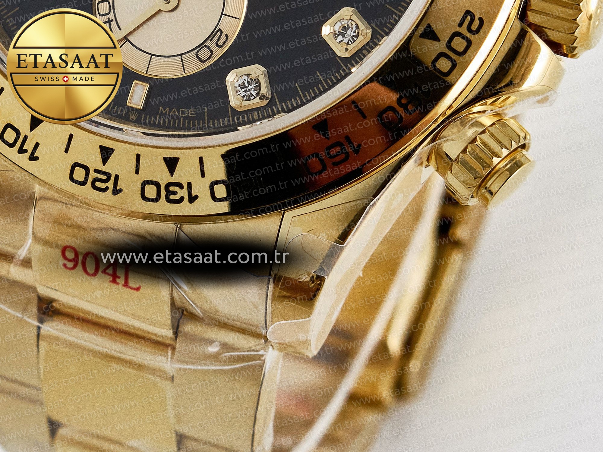 Kasa: Saatin kasası, 1:1 replikası olan 904L paslanmaz çelikten üretilmiş ve 18k sarı altınla kaplanmıştır. Bu sayede, hem dayanıklılık hem de lüks bir görünüm elde edilmiştir. Kasanın mükemmel işçiliği, saatin her detayında kendini gösterir. 904L paslanmaz çelik, korozyona karşı yüksek direnci sayesinde saatin uzun ömürlü olmasını sağlar. Altın kaplama ise, saate zengin ve göz alıcı bir görünüm kazandırır. Kasanın tasarımı, orijinal Rolex Daytona’nın hatlarını birebir yansıtarak, saatin otantik görünümünü korur.