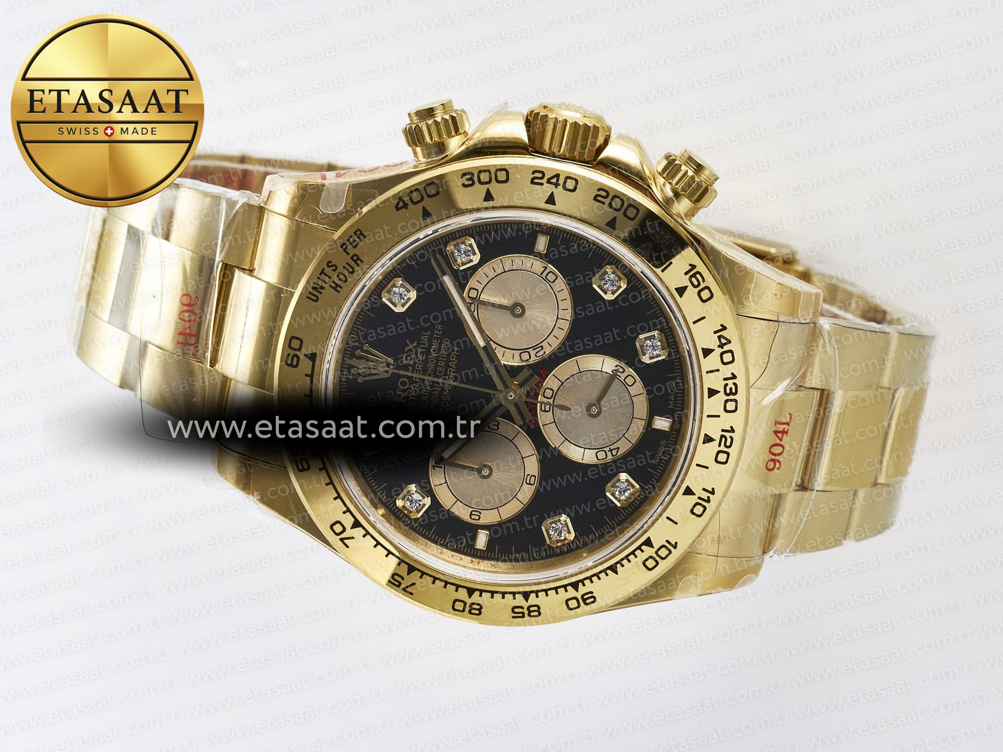 Kadran: Saatin kadranı, siyah zemin üzerine yerleştirilmiş pırlantalarla süslenmiştir. Bu detay, saate benzersiz bir ışıltı ve lüks bir hava katar. Pırlantaların yerleşimi, saatin okunabilirliğini etkilemeyecek şekilde özenle yapılmıştır. Kadran üzerindeki işaretler ve ibreler, yüksek kaliteli malzemelerden üretilmiş olup, saatin genel estetiğini tamamlar. Siyah kadran, altın detaylarla mükemmel bir kontrast oluşturarak, saatin şıklığını daha da vurgular. Kadranın tasarımı, Rolex Daytona’nın sportif ve zarif karakterini bir araya getirir.