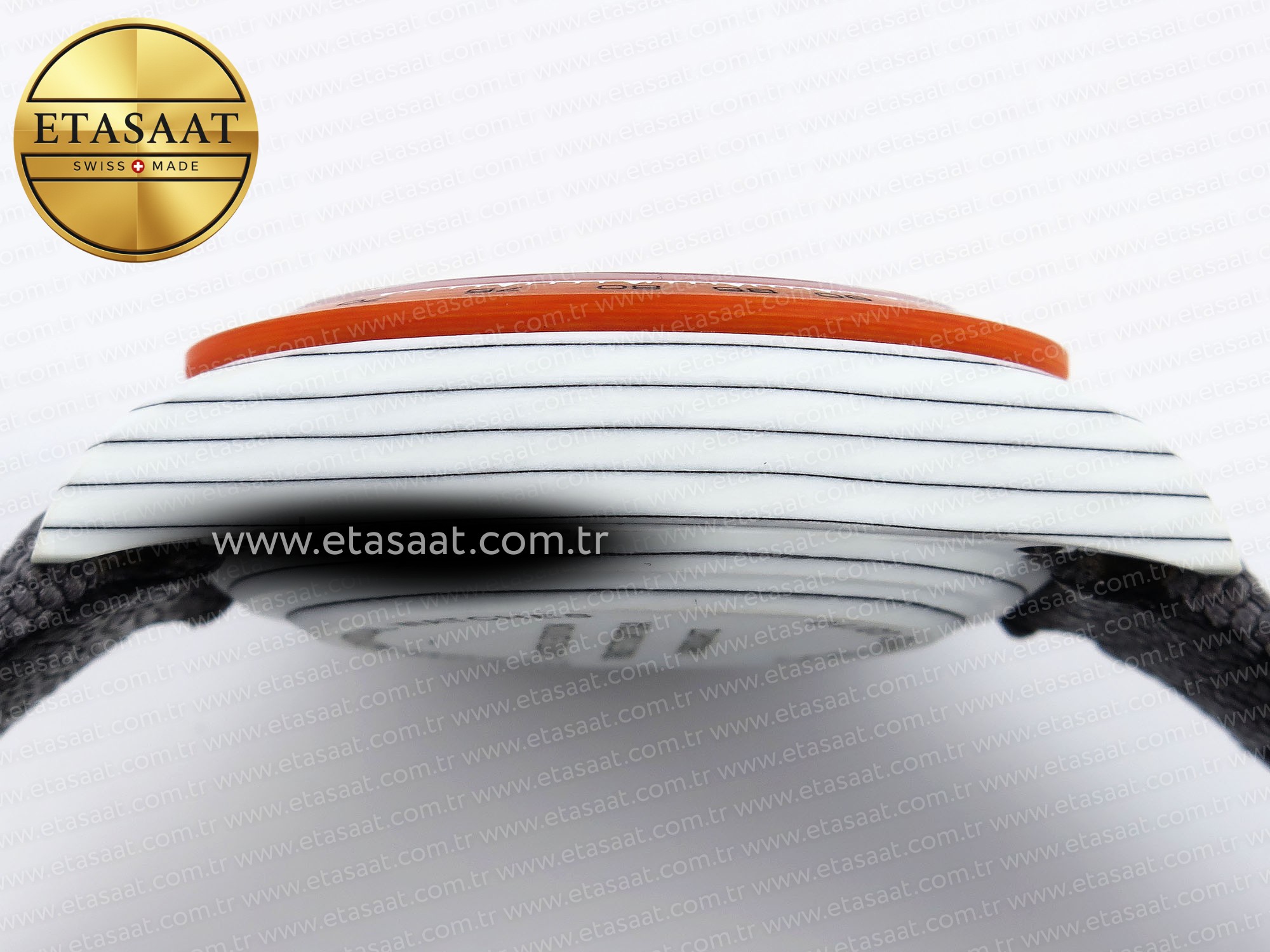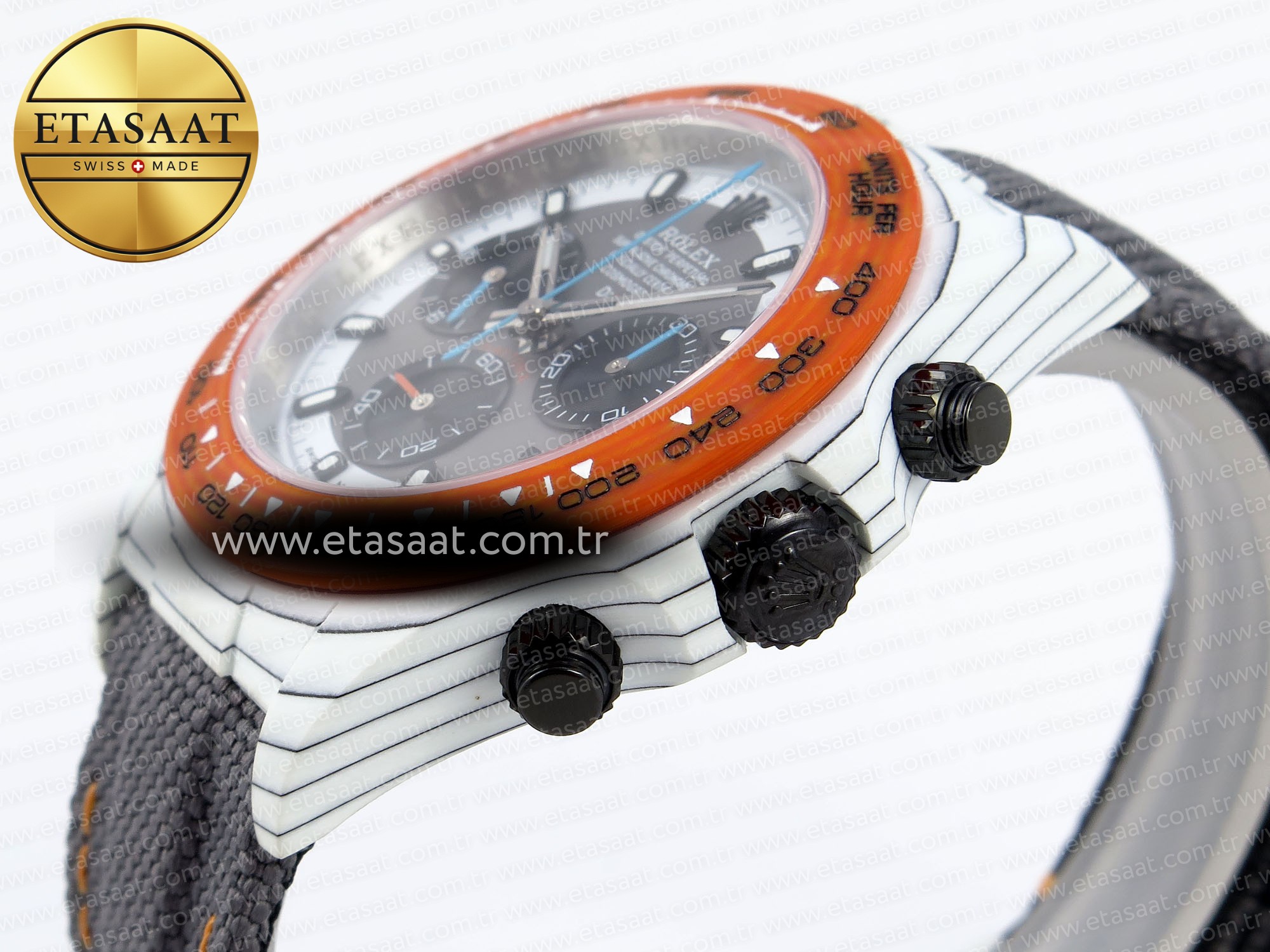 Kasa ve Tasarım: 40mm çapındaki beyaz karbon kasa, saate modern ve sportif bir hava katarken, aynı zamanda hafifliği ile de kullanım kolaylığı sağlar. Karbon malzemenin benzersiz dokusu, her bir saati eşsiz kılar. Turuncu takimetre bezel, saate canlılık katar ve kronograf fonksiyonlarını kullanırken pratik bir yardımcıdır. Kasanın ergonomik tasarımı, bileğinizde rahat bir his sağlar ve uzun süreli kullanımlarda bile konforu garanti eder.