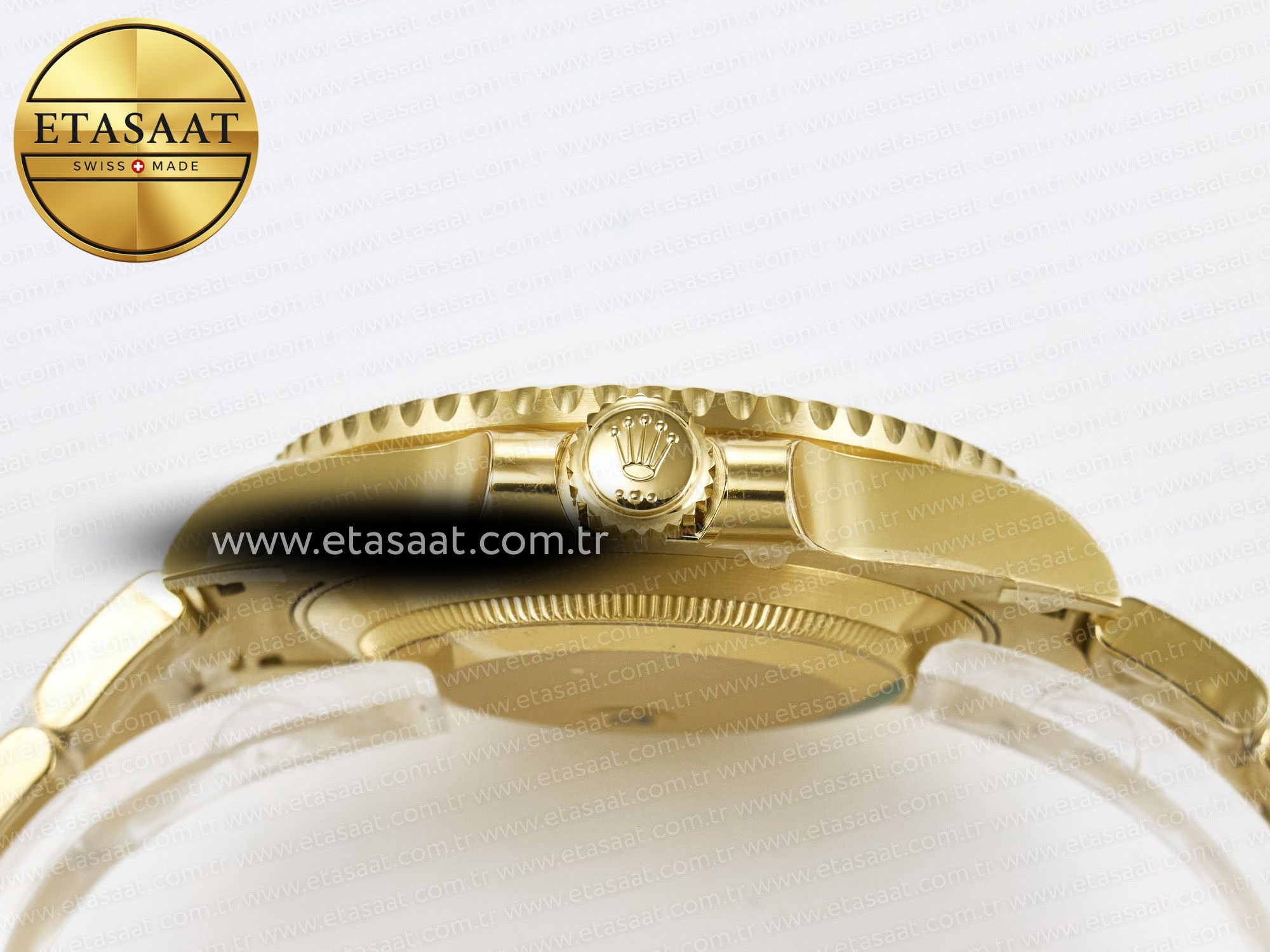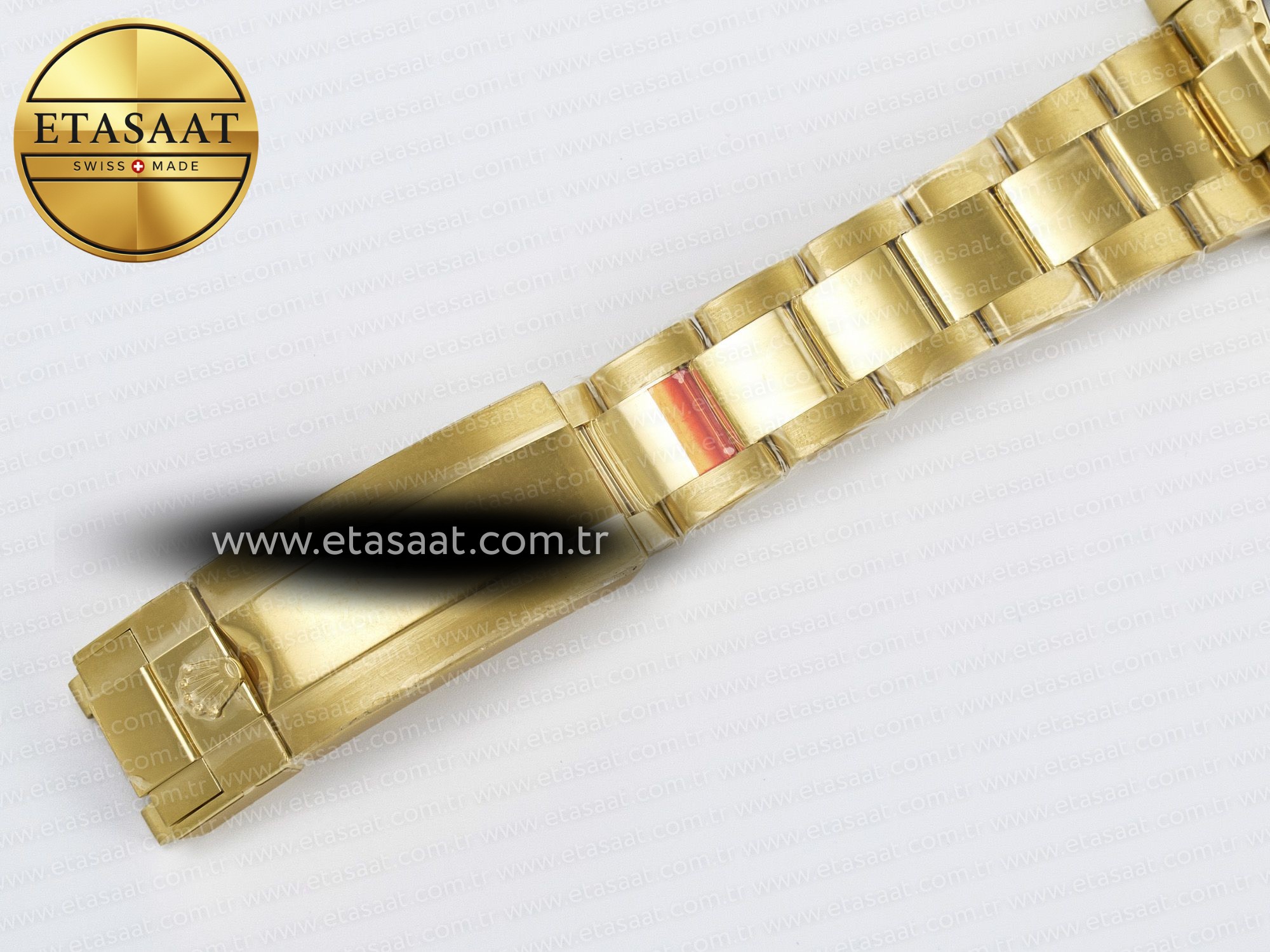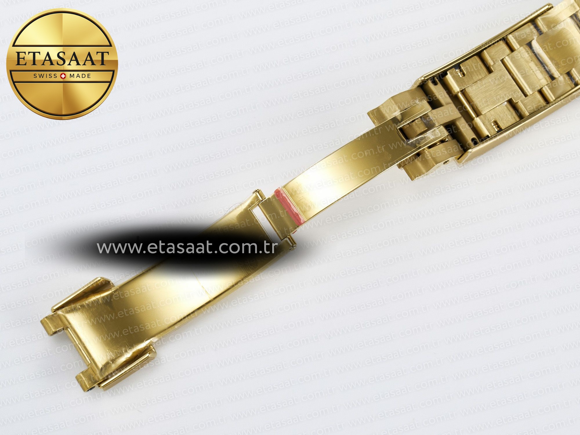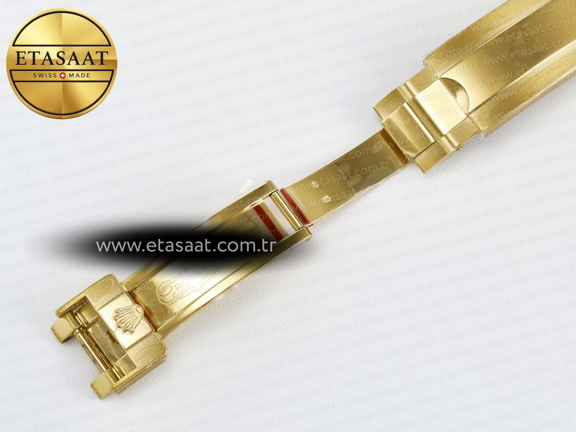 Strap: 18K yellow gold plated 904L stainless steel bracelet with perfect SEL, clasp and divers extension and smooth screws